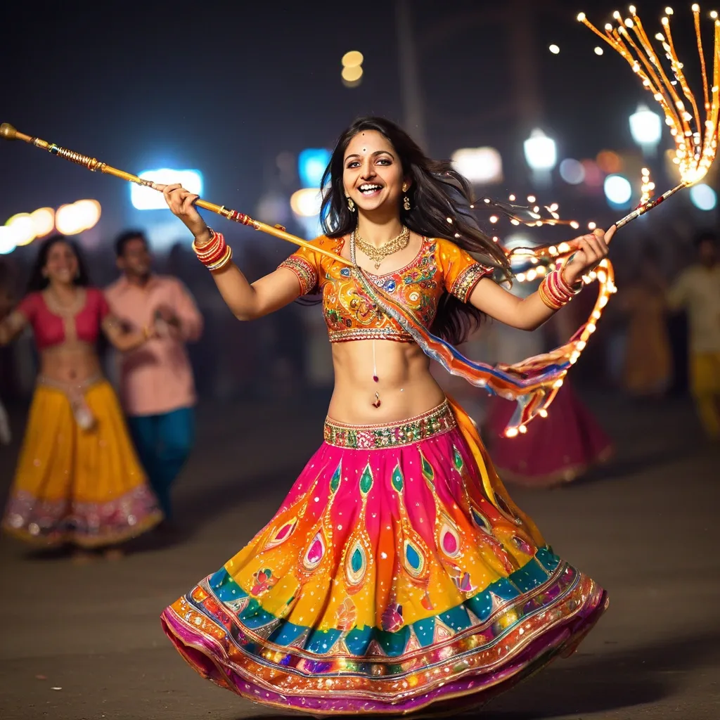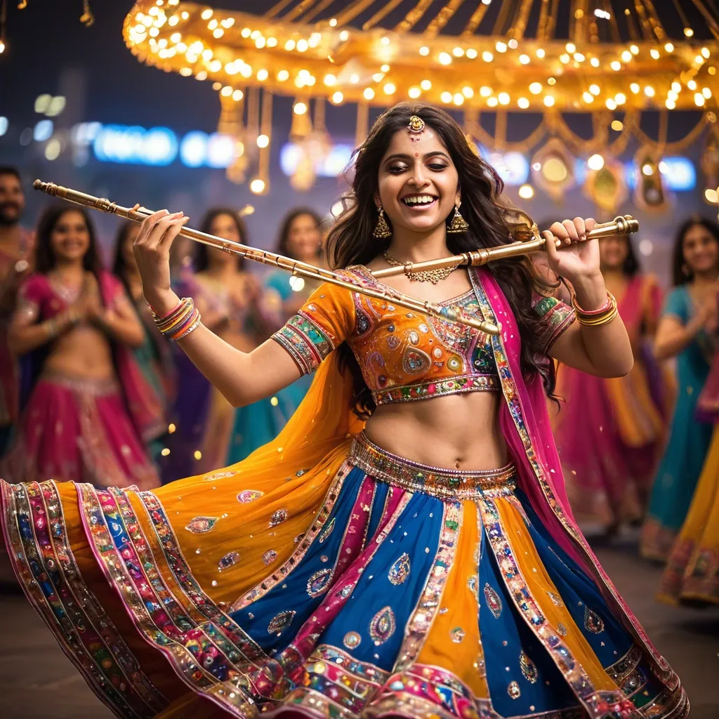 A beautiful woman extract face from image playing Dandiya with joyful abandon. She has a bright smile , her hair flying as she twirls , holding decorated Dandiya sticks , dressed in a colorful , traditional Ghagra choli with intricate embroidery and mirror work.The background is a lively blurred scene of a nighttime Navratri festival with Lord Krishna playing the flute. Divine Indian fantasy art of twinkling lights , and festive decorations.The image is captured from a slightly low angle , emphasizing her dynamic movement. ,