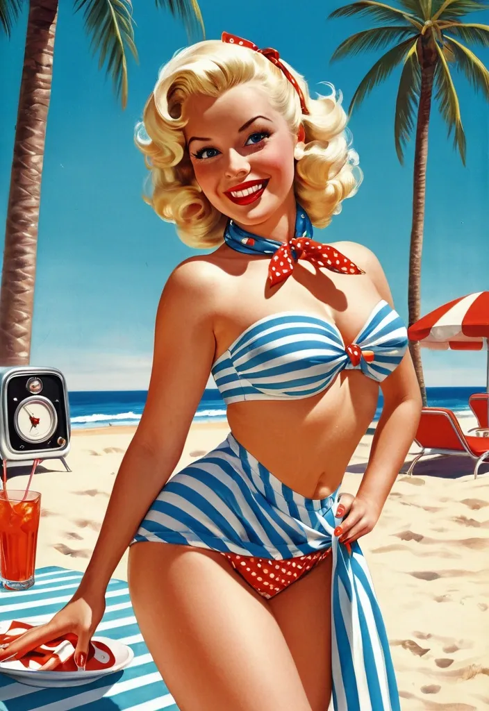 uma imagem vibrante e sedutora de uma pin-up dos anos 50. A personagem deve ter cabelo volumoso e ondulado , de um tom loiro platinado , preso com um lenço de bolinhas vermelhas. Ela está vestindo um biquíni de cintura alta em um padrão de listras azul e branca , acentuando suas curvas. O cenário é uma praia ensolarada , com um céu azul claro e palmeiras ao fundo , evocando uma atmosfera de verão. A pin-up está posando confiantemente , com uma mão na cintura e a outra segurando um copo de coquetel colorido. Seu olhar é encantador e brincalhão , com um sorriso que evoca a alegria e a liberdade dos anos 50. Adicione detalhes como uma toalha de praia listrada e um rádio vintage tocando música clássica para completar a cena , imagem estilo pin up vintage 1950 ,