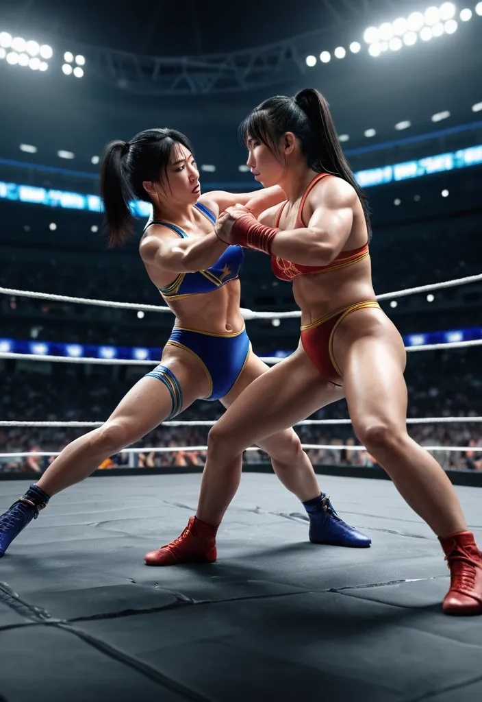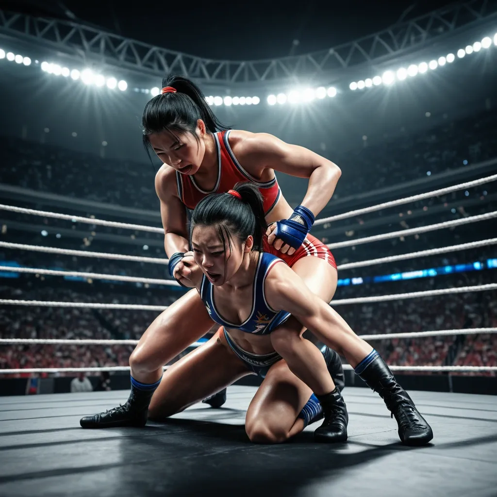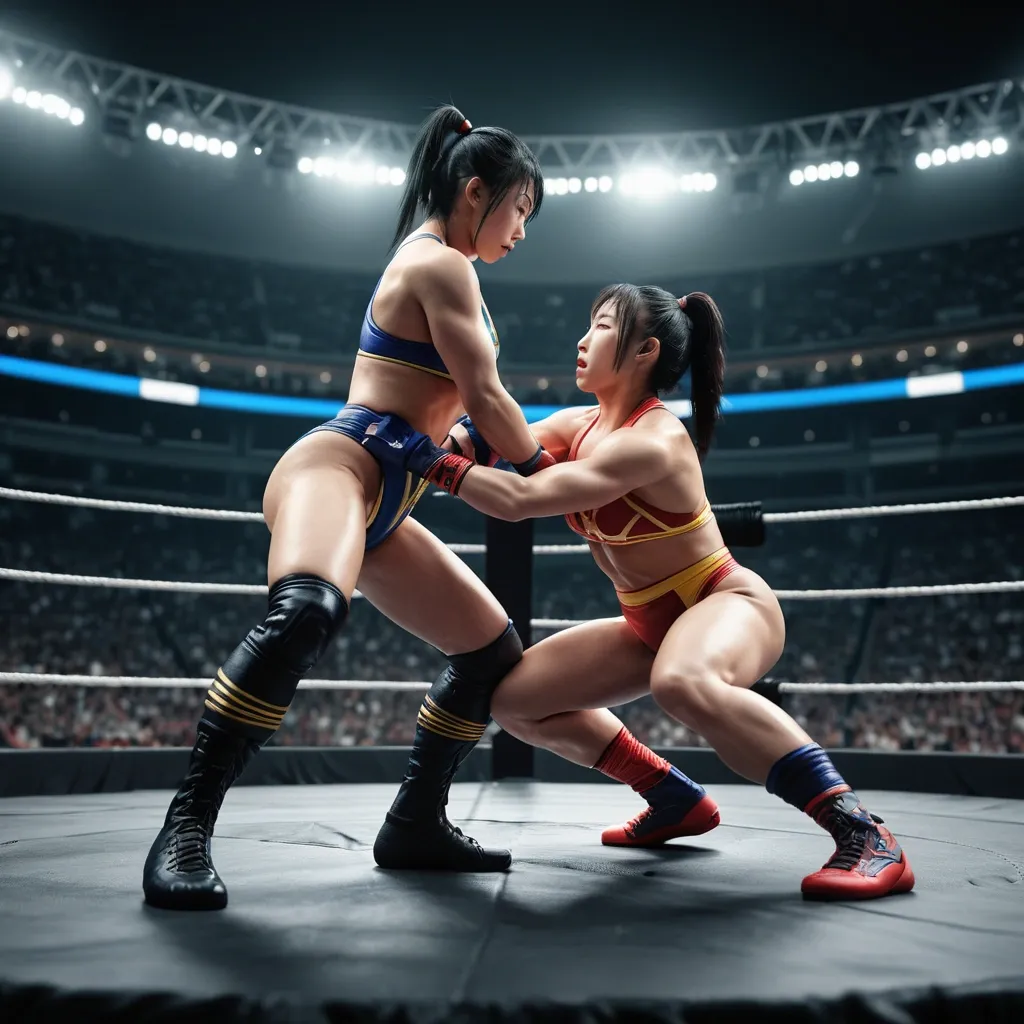 Masterpiece , ultra-detailed photorealistic full-length scene of two athletic Japanese women wrestling in a professional wrestling ring. Both wear modern colorful wrestling sports gear and fitted athletic suits. One woman has long black hair tied in a ponytail , the other has short dark brown hair. They are grappling in a dynamic wrestling hold in the center of the ring , showing strength and motion like a real professional wrestling match. The ring has visible ropes , padded turnbuckles , and a textured mat. Bright arena spotlights shine from above , with a stadium crowd blurred in the background. Cinematic sports photography style , dramatic lighting , realistic skin texture , natural muscle definition , sweat details , dynamic movement , authentic wrestling pose , high contrast arena lighting , depth of field , ultra sharp focus , 8k photorealism , professional sports photography composition. ,