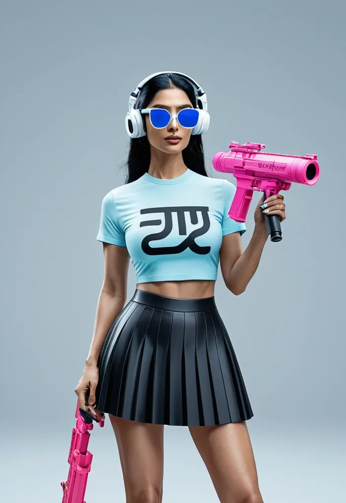 40% of the screen is completely white. There are so many text and a piece 3D things. Create a piece of minimalist and elegant modern art. Professional photo , in the style of Matt Pluz and James Macari , Sony Alpha 7R V Full-Frame Mirrorless Interchangeable Lens Camera autofocus , FE 70-300mm F4.5-5.6 G OSS Full-frame Telephoto Zoom G Lens with Optical Steady Shot , polarizing filter The Selens 5-in-1 39. Triangle Reflector , vibrant colors. A 42s Indian very cutest woman in a Walt Disney printed t-shirt and black skirt , holding sci-fi futuristic heavy water-gun , Wearing a phenomenally elegant exceptionally modern designed , strong and vibrant colored , vivid neon pastel sky-blue pink colored headphone. All sorts of special image effects are applied to parts of the entire screen , tremendously perspective and the outlook are all fused together and expressed in true clear colors. The text is in white where it overlaps with the 3D object. The gray background Main Typography (Center Focus) , Design bold , 3D stylized Hindi calligraphy text: “होली है” , Large , dramatic Devanagari lettering. Thick rounded strokes. or a combination of small symbols and lines. A phenomenally close-up to the unexpectedly art. The entire screen is naturally bright and dazzlingly vibrant. The high resolution and fine details are reminiscent of an electron microscope with sharp effect singularly strongest ever. ,