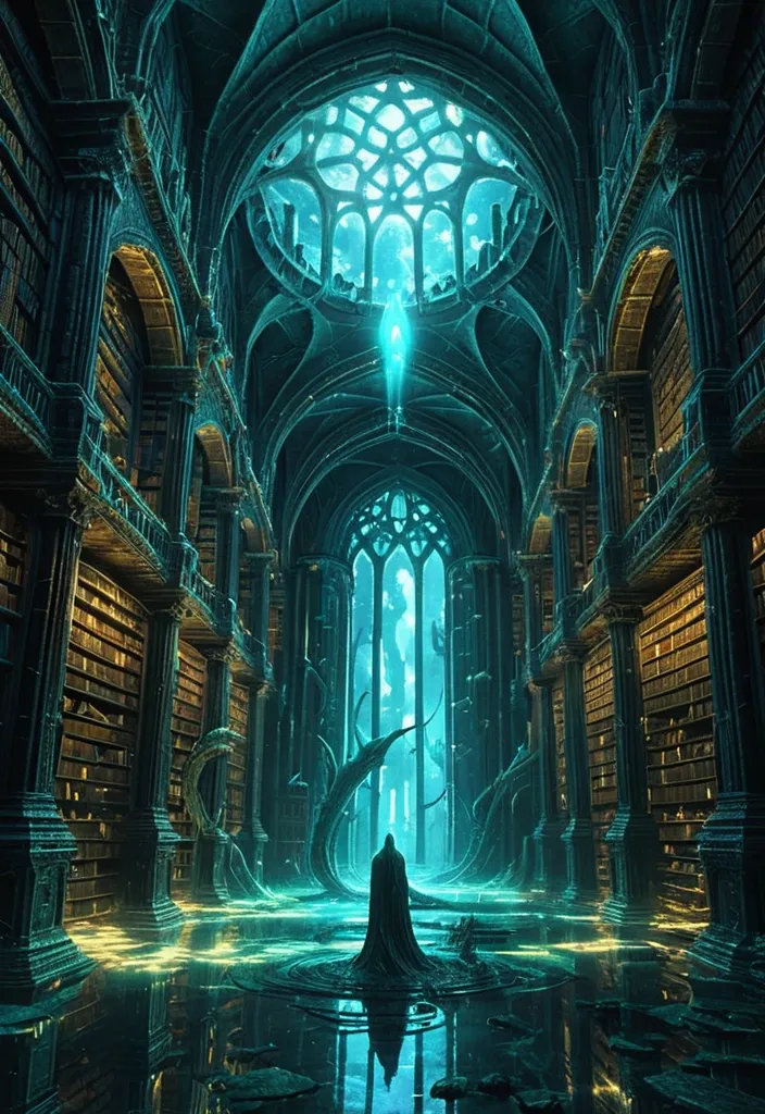 A forgotten , ancient library submerged beneath a bioluminescent alien ocean. Giant , glowing fairy-tale drift through vast halls lined with crumbling , impossibly intricate bookshelves. Sunlight filters weakly from the surface , creating ethereal shafts of light that illuminate dust motes and schools of strange , deep-sea creatures. The style should be a blend of dark fantasy illustration and hyperrealism , with textures that feel both ancient and otherworldly , inspired by the fantastical world-building of Zdzisław Beksiński. ,