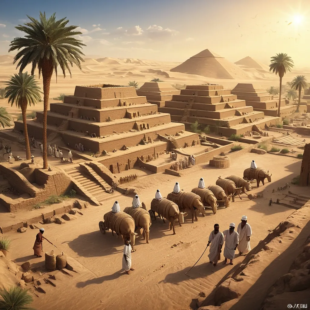 Eridu in 4000 BCE , ancient Sumerian city rising from the desert plain , mudbrick ziggurat under construction , reed and clay houses clustered near irrigation canals , priests and workers in simple linen garments , palm trees and ox-drawn carts , early temple offerings and smoke from altars , atmosphere of sacred origin and early civilization , dawn , clear skies , summer , Digital Painting , 4K ,