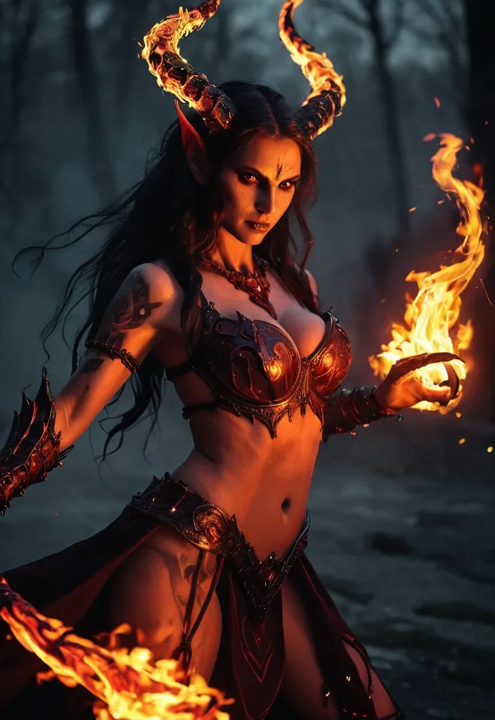 This is a highly detailed CGI artwork by Acla-DoodFantasy on DeviantArt. It depicts a striking female demon with glowing red eyes and black , curved horns. She has fair skin , blonde hair , and wears a red , hooded cloak with intricate patterns. A large , ornate staff with a skull and flames is in her left hand. The background features a fiery , apocalyptic landscape with a partially visible planet. The overall mood is dark and intense , with a blend of fantasy and horror elements. ,