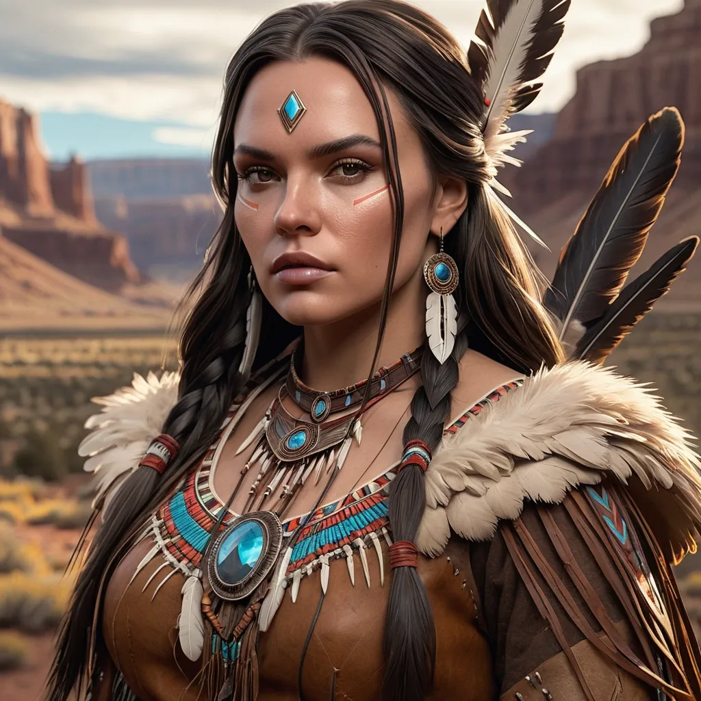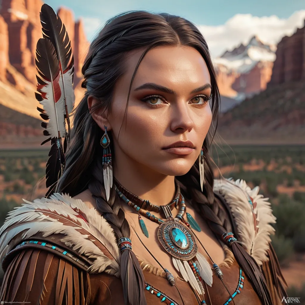 mdjrny-v4 style portrait photograph of Madison Beer as Pocahontas , young beautiful native american woman , perfect symmetrical face , feather jewelry , traditional handmade dress , armed female hunter warrior , (((wild west))) environment , Utah landscape , ultra realistic , concept art , elegant , ((intricate)) , ((highly detailed)) , depth of field , ((professionally color graded)) , 8k , art by artgerm and greg rutkowski and alphonse mucha ,