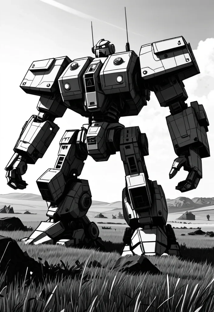 PROMPT DE GERAÇÃO DE IMAGEM OTIMIZADO (Para Midjourney/DALL-E/etc.): "crie um cenário de guerra onde a tecnologia permite robos gigantes em combate (aproximados 15m , para que os mesmos seja eficientes em áreas de campo aberto) , Desenho Animado , Iluminação: Dramática (Alto Contraste) , Tonalidade: Preto e Branco" --ar 16:9 --------------------------------- DETALHES DA ESTRUTURAÇÃO: - Estilo: Desenho Animado (Estilo Disney) - Proporção: 16:9 (Paisagem) ,