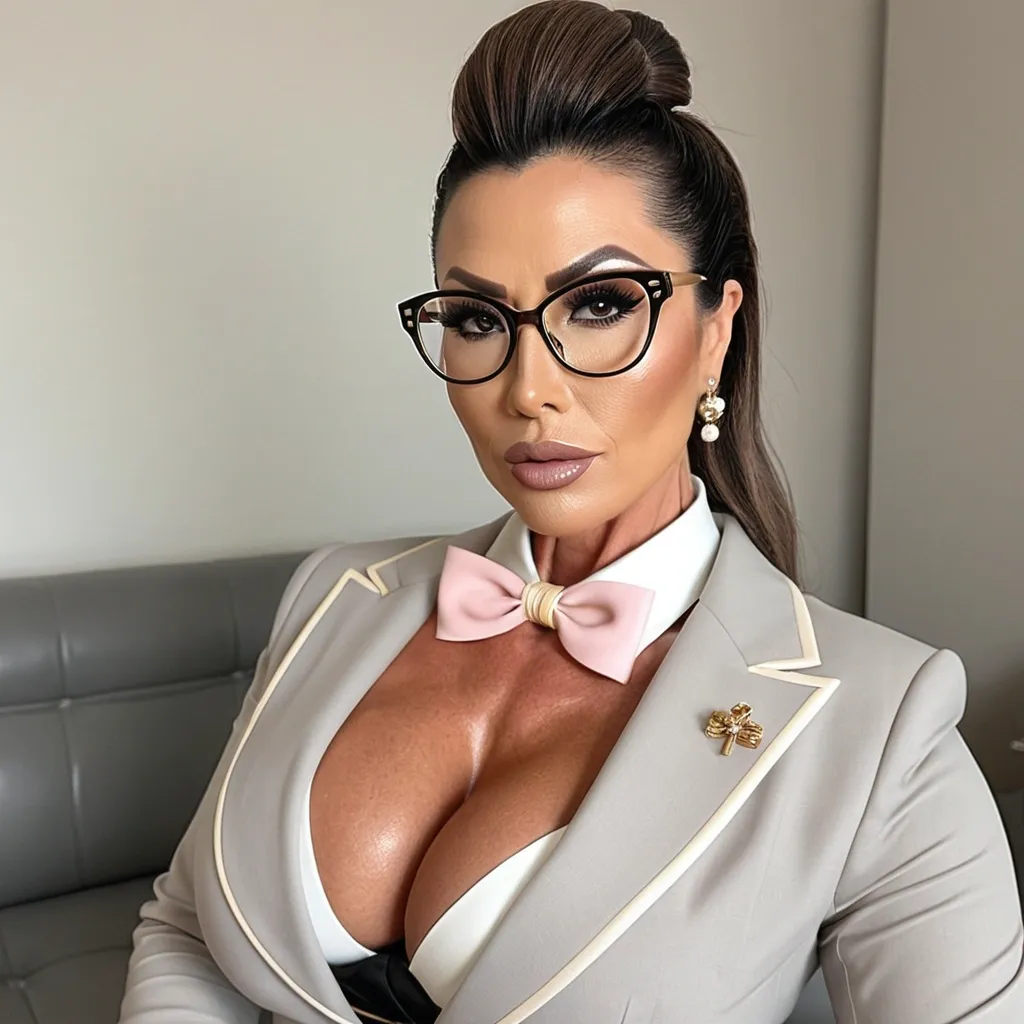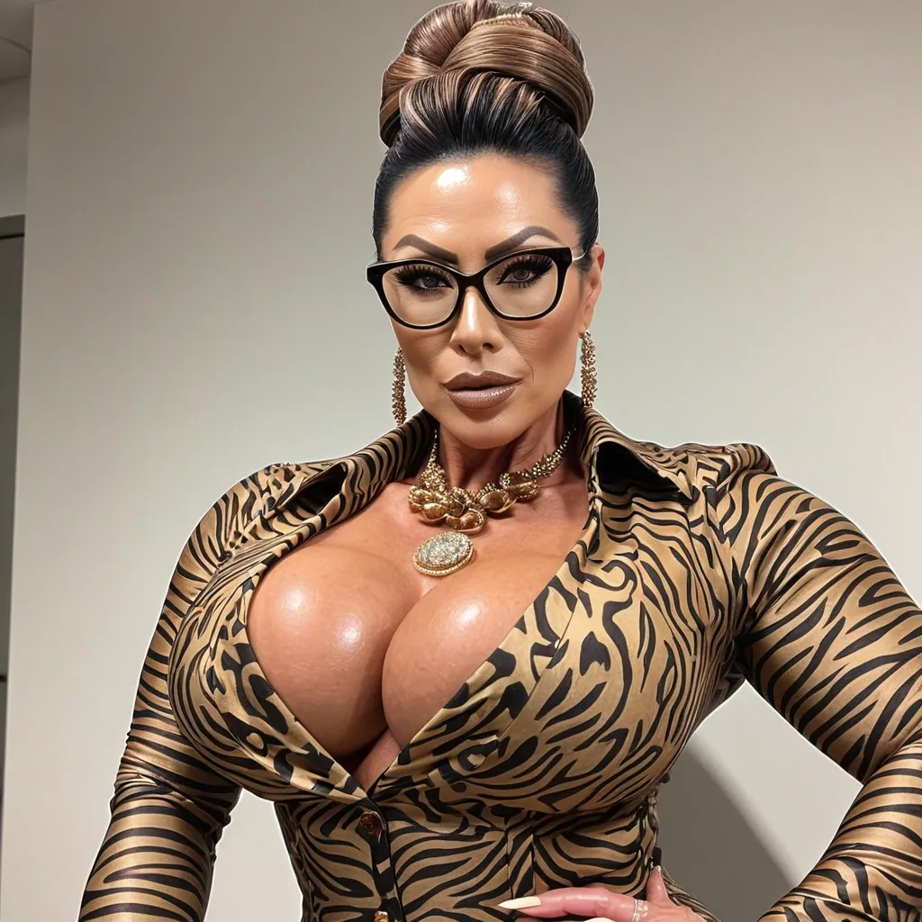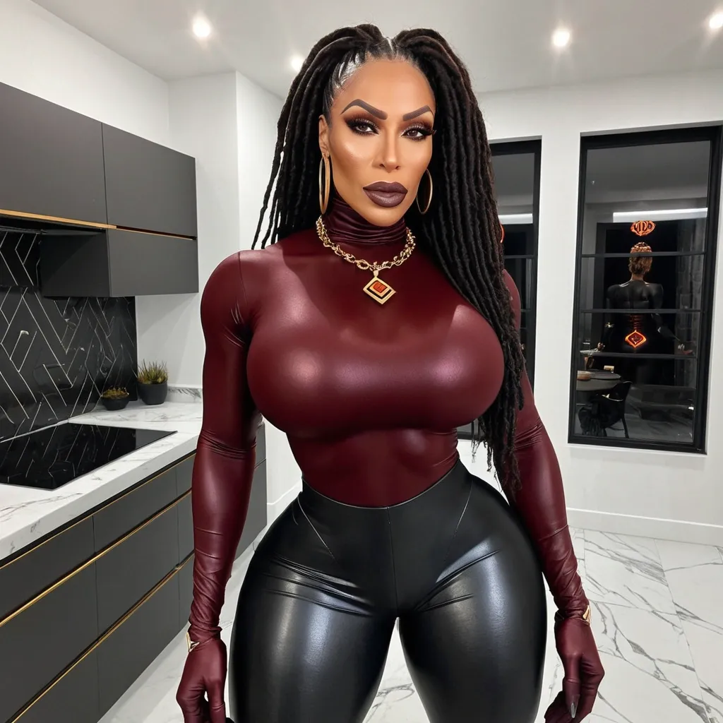 Generate Gorgeous female boss , bimbo , 45 years old , very dark-skinned African-American woman , brown hair , gorgeous hazel eyes , hourglass body , abnormally massive female bodybuilder , gorgeous , close up , full lips , big booty , dreadlocks feminine silhouette , too big breast , big booty , sexy thighs abs , silhouette , up close , flexing biceps , beautiful hazel eyes , legs are iconic and defining physical feature , both visually and in terms of combat ability.wearing an outfit that is a striking blend of elegance , power , and femininity , designed to command attention in any room. The suit is tailored to perfection , hugging the wearer’s curves with precision while emphasizing a structured silhouette. The fabric itself is a refined grey tweed patterned with subtle white grid lines , giving the suit a texture that feels both sophisticated and modern. The blazer features broad blue lapels and gold button accents , adding a luxurious touch that elevates the look beyond typical business attire. The matching high-waisted trousers elongate the frame , further enhancing the poised and commanding effect of the ensemble.The styling choices amplify the boldness of the suit. The inner blouse is a silky , greybutton-down shirt that complements the tweed’s tone while introducing a softer , feminine balance to the sharp tailoring of the jacket. The blouse peeks out neatly from under the blazer , maintaining elegance without drawing focus away from the suit’s commanding cut. Accessories are kept minimal yet intentional: a delicate layered gold necklace and hoop earrings that add glimmers of light and luxury without overpowering the outfit. The choice of voluminous , honey-brown braids cascading down her shoulders frames the face with both confidence and glamour , completing the commanding visual.Altogether , this look communicates a blend of authority and allure. It is business-ready yet fashion-forward , balancing corporate structure with vibrant femininity. The color palette blue , grey and gold avoids being overly delicate , instead embracing the richness of texture , structure , and presence. This is the kind of ensemble that speaks to ambition , sophistication , and personal style—ideal for someone who thrives in positions of influence but insists on expressing her individuality with bold elegance. It’s not just clothing—it’s a statement of power wrapped in grace. In luxury living legs that could crush a watermelon , skirt high boots are a bold and striking statement piece , crafted in glossy black patent leather that gives them a sleek , polished finish. Rising to just below the knee , the boots feature three adjustable buckle straps along the shaft , adding both edge and detail to their design. The towering stiletto heel , paired with a thick platform sole , creates an ultra-dramatic silhouette that elongates the leg and exudes power and confidence. With their combination of shine , height , and structure , these boots perfectly balance fierce femininity with high-fashion allure. High cheekbones , prominent jawline , gorgeous big brown eyes , freckles , enormous breast , enormous butt , black , gray and gold button t-shirt , black work pants , dark burgundy leather coat and matching gloves standing in beautiful kitchen wearing burgundy orange and black velvet futuristic t-shirt , diamond necklace ,