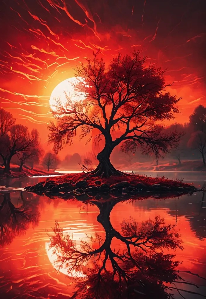 masterpiece , best quality , ultra detailed , cinematic lighting , dramatic sunset , glowing sun disk , red orange sky , lone tree silhouette with red leaves , reflective water surface , soft fog , depth of field , textured brush strokes , oil painting style , surreal fantasy landscape , warm tones , high dynamic range , volumetric light , artistic composition ,