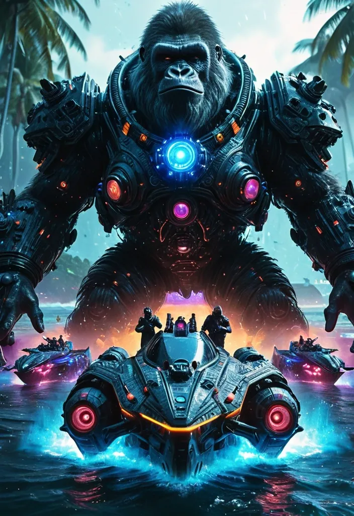 Highly detailed cyberpunk vehicle rising from ocean , massive Noumea art style spaceship vibrant color scheme , intense design , bizarre and disturbing elements surrounding it , central core emitting glowing blue energy , dense black-mist vapor pouring symmetrically from both sides of the machine. ocean and in front a group of Gorillas with their speed-boats and guns , and in front of them is a old-Gorilla leader. The camera captures her in cinematic 4K , soft bokeh background , lens flare , lively atmosphere , realistic lighting and shadows , ultra-detailed. ,