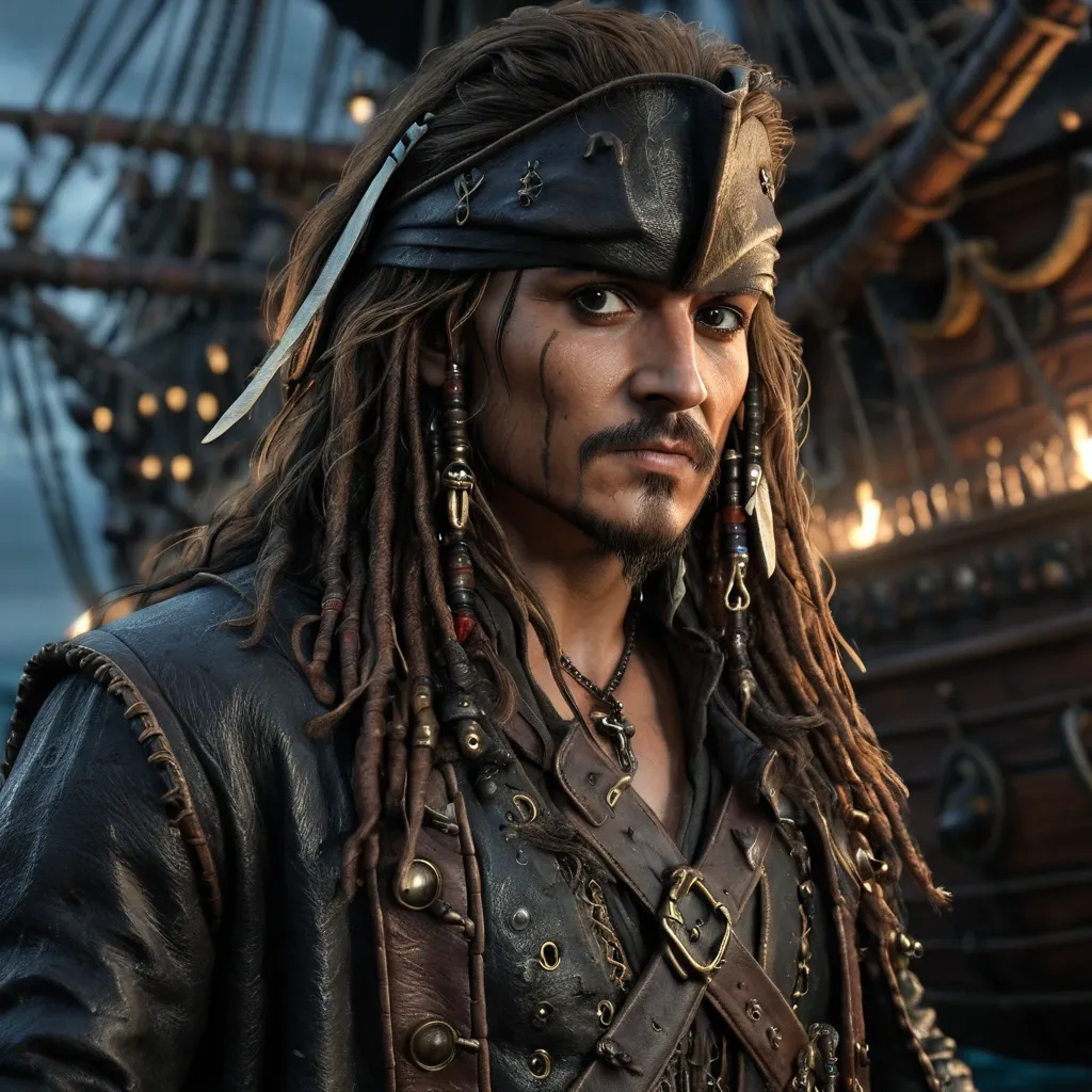 Pirates of the Caribbean /// male Jack Sparrow with long hair wearing detailed leather coat , pirate ship scene , highly detailed skin , face sharp focus , detailed eyes and pupils , detailed hair , intricate details and sharp , masterpiece , global illumination , bokeh , best quality , Pirates of the Caribbean style , photorealistic , realistic , 8k , 3d ,