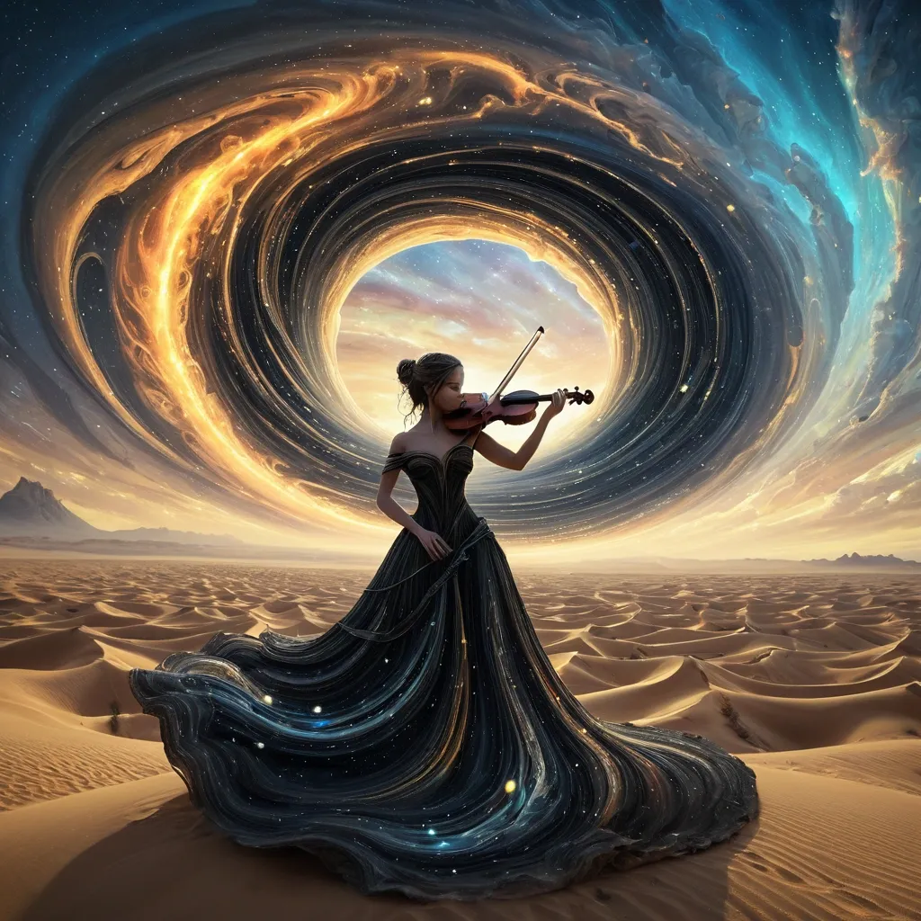 A swirl of gray powder electronic dots emerges a transparent , smoky outline of a solitary figure in a flowing veil stands atop a black sand dune , motion to down made of sand dusting , on a black background , black on black , inversion of water drops , fractal , neon amber motion , carving through streaking blue light in vortex eye shape. Style: deeply spiritual sci-fi art , reminiscent of digital hyper-realism combined with cosmic impressionism. Focus on intricate detail of light and energetic flow. ,