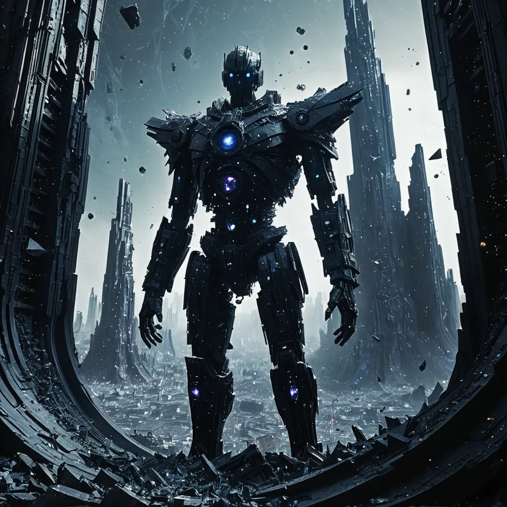 A colossal , obsidian automaton stands guard over a shattered crystal city at the edge of a black hole. Fragmented memories and distorted realities drift like cosmic dust around it. The style is a hyperrealistic , dark fantasy matte painting , with intense , fractured volumetric lighting and a cinematic poster composition that hints at cosmic horror. ,