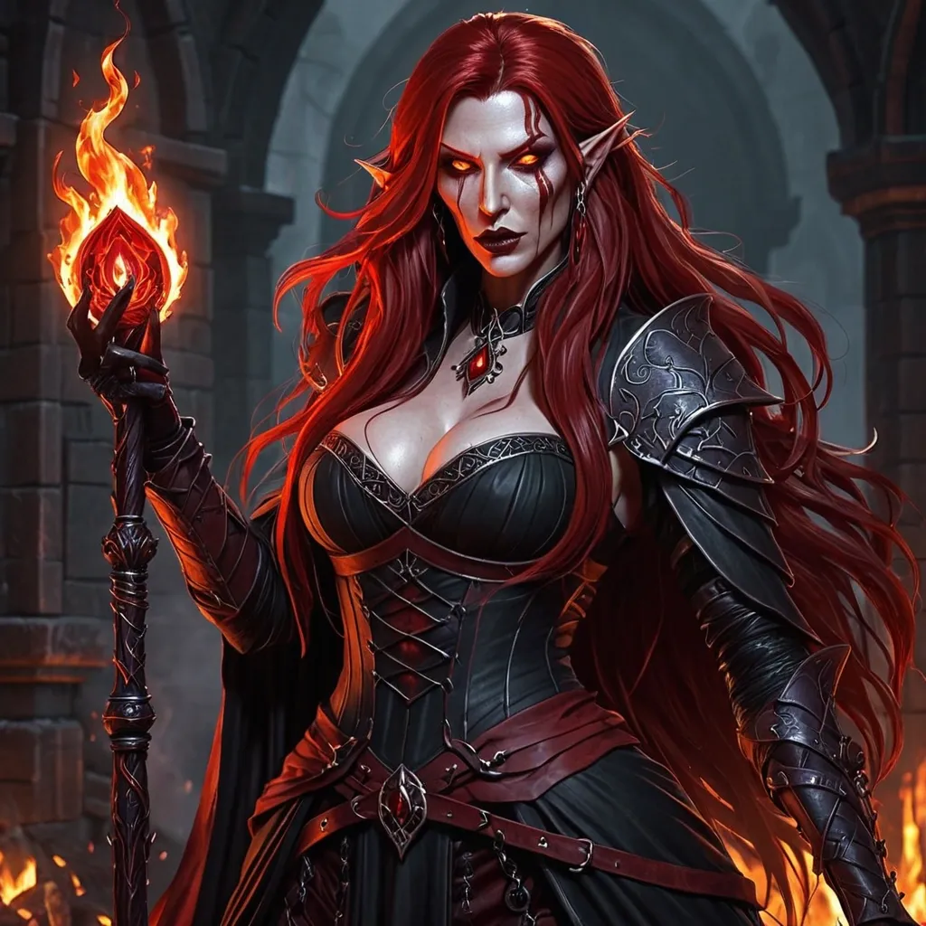 Create an image of a dnd character. Here is a listing of her traits: 1. Female 2. Half human/half eladrin elf 3. Rogue thief and assassin 4. Recently picked up a multiclass into warlock as well 5. Warlock subclass is Pact with Genie , specifically a Djinni (air) of the Genie options 6. She is an outstanding thief with a complicated and difficult background 7. She is mischievous , playful , black-bellied , sly , and very charismatic and charming and it tends to show up on her face with a playful look. She has large eyes that are tinged with black and rose colour 9. Delicate features 10. Her hair is waist length and is an ombre of black to rose quartz 11. She should be wearing a typical thief Rogue looking outfit , like black clothes , scarf and cloak , clothing that is comfortable and easy to move around and go silently and unseen in the dark ,