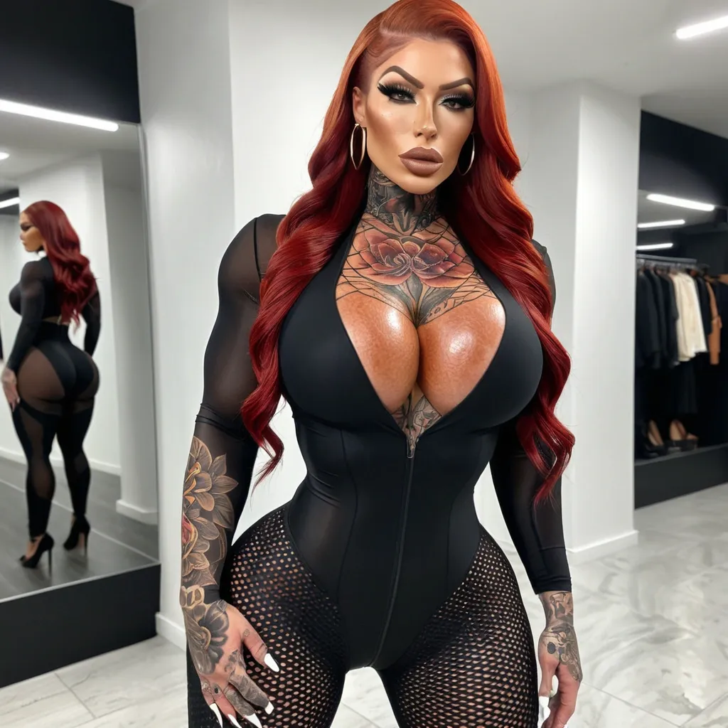 Generate Gorgeous female boss , bimbo , hourglass body , abnormally massive female bodybuilder , gorgeous , close up , full lips , big booty , redheaded , freckles on face and breast , braided design hair , feminine silhouette , too big breast , big booty , sexy thighs abs , silhouette , up close , flexing biceps , beautiful green eyes , legs are iconic and defining physical feature , both visually and in terms of combat ability.wearing an outfit that is a striking blend of elegance , power , and femininity , designed to command attention in any room. The suit is tailored to perfection , hugging the wearer’s curves with precision while emphasizing a structured silhouette. The fabric itself is a refined grey tweed patterned with subtle white grid lines , giving the suit a texture that feels both sophisticated and modern. The blazer features broad blue lapels and gold button accents , adding a luxurious touch that elevates the look beyond typical business attire. The matching high-waisted trousers elongate the frame , further enhancing the poised and commanding effect of the ensemble.The styling choices amplify the boldness of the suit. The inner blouse is a silky , greybutton-down shirt that complements the tweed’s tone while introducing a softer , feminine balance to the sharp tailoring of the jacket. The blouse peeks out neatly from under the blazer , maintaining elegance without drawing focus away from the suit’s commanding cut. Accessories are kept minimal yet intentional: a delicate layered gold necklace and hoop earrings that add glimmers of light and luxury without overpowering the outfit. The choice of voluminous , honey-brown braids cascading down her shoulders frames the face with both confidence and glamour , completing the commanding visual.Altogether , this look communicates a blend of authority and allure. It is business-ready yet fashion-forward , balancing corporate structure with vibrant femininity. The color palette blue , grey and gold avoids being overly delicate , instead embracing the richness of texture , structure , and presence. This is the kind of ensemble that speaks to ambition , sophistication , and personal style—ideal for someone who thrives in positions of influence but insists on expressing her individuality with bold elegance. It’s not just clothing—it’s a statement of power wrapped in grace. In luxury living legs that could crush a watermelon , skirt high boots are a bold and striking statement piece , crafted in glossy black patent leather that gives them a sleek , polished finish. Rising to just below the knee , the boots feature three adjustable buckle straps along the shaft , adding both edge and detail to their design. The towering stiletto heel , paired with a thick platform sole , creates an ultra-dramatic silhouette that elongates the leg and exudes power and confidence. With their combination of shine , height , and structure , these boots perfectly balance fierce femininity with high-fashion allure. She is wearing a She wears a form-fitting black suit with a deep plunging neckline that reveals elaborate floral tattoos across her chest and a sheer fishnet panel accentuating her exaggerated bust and toned abs , paired with tight high-waisted pants that emphasize her wide hips and thick thighs. The low-angle camera perspective ,