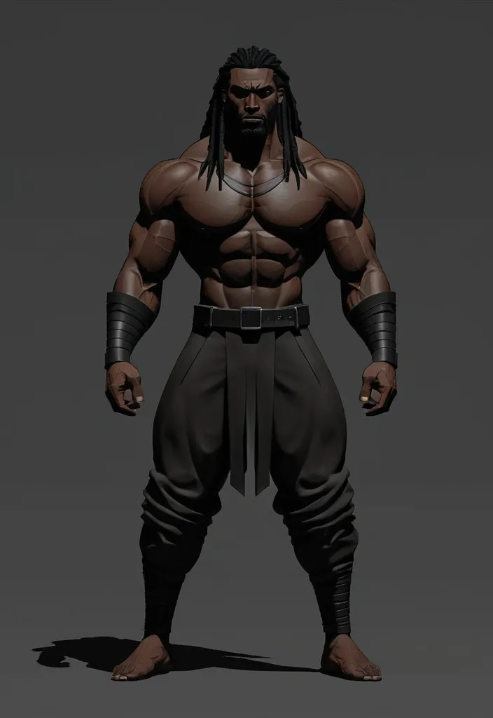 STYLE: Flat Action Fantasy (Simplified) — bold clean outlines , large shadow blocks , smooth shapes , minimal texture , simplified anatomy , strong silhouette. Aidan is a tall , powerful Black man with dark skin. His body is athletic but simplified: fewer muscle lines , cleaner shapes , and broad silhouette. He has long dark dreadlocks drawn in large , unified strands rather than many small ones. His wolf-like eyes are sharp but simple , no glow unless total darkness. Clothes: dark sleeveless top , simple pants , thick belt. Arm bracers are minimal , with no excessive detail. No small straps , no extra folds. Overall look: imposing , clean , animation-ready. ,