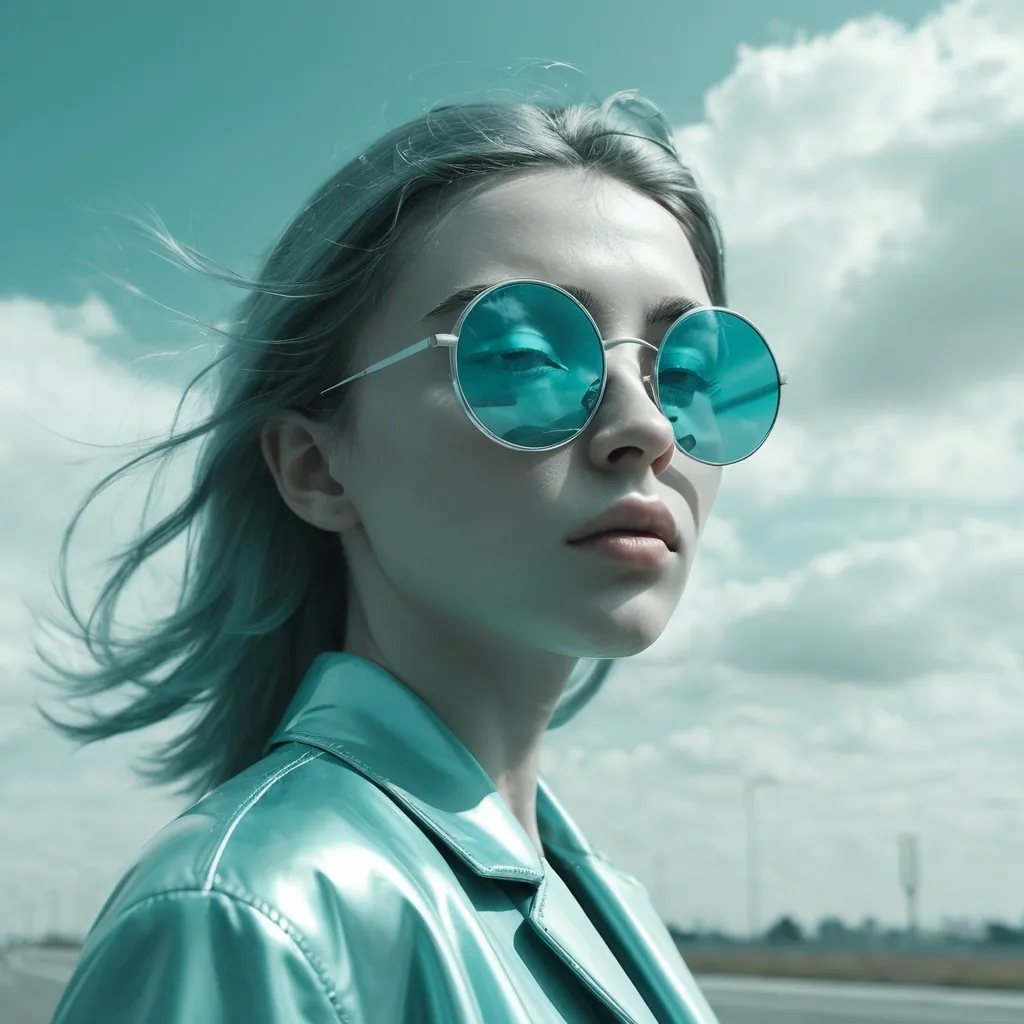 A surreal , photorealistic portrait of a person wearing round reflective sunglasses , set against a softly clouded sky. The image has a motion-blur effect that sweeps horizontally across one side of the face , creating a sense of speed , transition , or digital distortion. The color palette is monochromatic teal or cyan , giving the image a cool , cinematic tone. The subject’s expression is calm and introspective , with subtle highlights on the lips , skin , and glasses. Their hair moves slightly in the breeze , adding texture and realism. The overall composition feels dreamlike and modern , balancing clarity and blur for an artistic , futuristic atmosphere. ar-9:16 ,