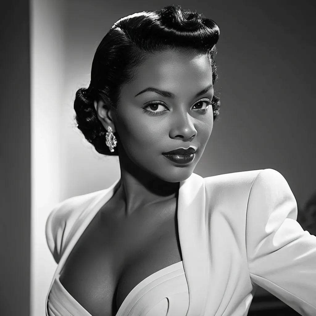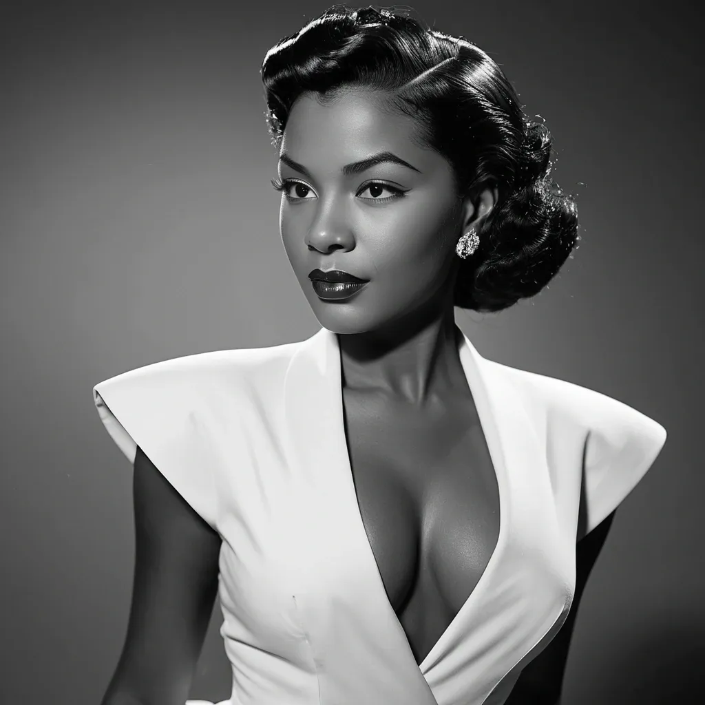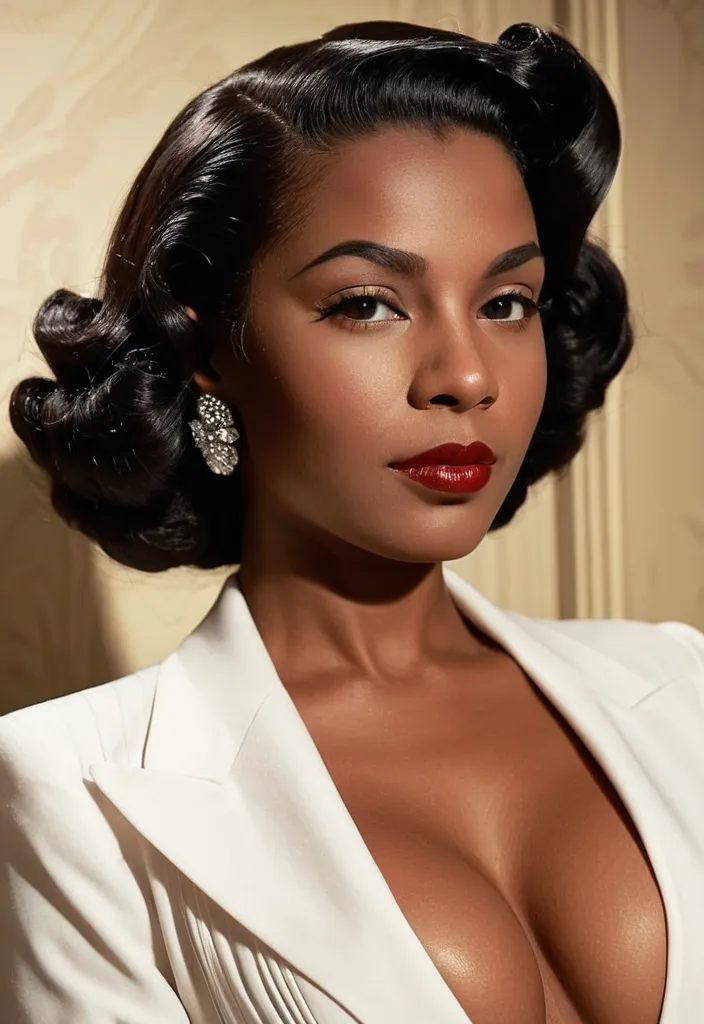 Stunning African-American woman in 1940s glamour , radiating timeless elegance and old-Hollywood allure. - Face: Flawlessly smooth , rich brown skin with a luminous glow , sharp contoured cheekbones , full , perfectly shaped lips in a soft rose shade , and meticulously sculpted brows that give her an air of poised intensity. - Hair: Elegant victory rolls and soft , glossy curls swept to one side in a classic 1940s finger-wave updo , every strand polished and in place , framing her face like a crown. - Body: Graceful yet curvaceous , with a pronounced hourglass silhouette emphasized by her tailored outfit — full , rounded bust , nipped-in waist , and soft , feminine shoulders. - Eyes: Large , expressive , and dramatically lined with thick lashes and subtle shadow , giving a sultry , knowing gaze that pulls you in instantly. - Pose: Close-up selfie angle , head slightly tilted with a playful yet commanding expression — lips parted mid-sentence , one brow arched , exuding confidence and a hint of mischief. - Clothes: Crisp white blazer-style dress with a deep V-neckline and structured shoulders , impeccably tailored to accentuate her décolletage and waist — pure 1940s power-dressing with a sensual twist. - Beauty: Breathtakingly gorgeous in that golden-era bombshell way — the kind of face that could launch a thousand films , blending regal composure with undeniable sensuality. She’s giving full-on Lena Horne , Dorothy Dandridge , peak vintage glamour realness — absolutely iconic. ,