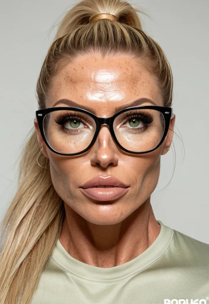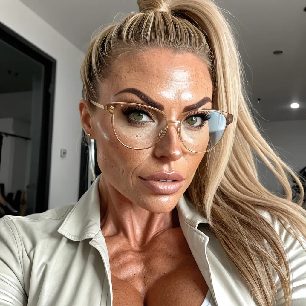 35 years old , Generate Gorgeous female physical fitness trainer , bimbo , circle eye glasses hourglass body , abnormally massive female bodybuilder , gorgeous , close up , full lips , big booty , hair in ponytail , freckles , dirty blonde hair , short hair feminine silhouette , too big breast , big booty , sexy thighs abs , silhouette , up close , flexing biceps , gorgeous light brown eyes , legs are iconic and defining physical feature , both visually and in terms of combat ability.wearing an outfit that is a striking blend of elegance , power , and femininity , designed to command attention in any room. The suit is tailored to perfection , hugging the wearer’s curves with precision while emphasizing a structured silhouette. The fabric itself is a refined grey tweed patterned with subtle white grid lines , giving the suit a texture that feels both sophisticated and modern. The blazer features broad blue lapels and gold button accents , adding a luxurious touch that elevates the look beyond typical business attire. The matching high-waisted trousers elongate the frame , further enhancing the poised and commanding effect of the ensemble.The styling choices amplify the boldness of the suit. The inner blouse is a silky , greybutton-down shirt that complements the tweed’s tone while introducing a softer , feminine balance to the sharp tailoring of the jacket. The blouse peeks out neatly from under the blazer , maintaining elegance without drawing focus away from the suit’s commanding cut. Accessories are kept minimal yet intentional: a delicate layered gold necklace and hoop earrings that add glimmers of light and luxury without overpowering the outfit. The choice of voluminous , honey-brown braids cascading down her shoulders frames the face with both confidence and glamour , completing the commanding visual.Altogether , this look communicates a blend of authority and allure. It is business-ready yet fashion-forward , balancing corporate structure with vibrant femininity. The color palette blue , grey and gold avoids being overly delicate , instead embracing the richness of texture , structure , and presence. This is the kind of ensemble that speaks to ambition , sophistication , and personal style—ideal for someone who thrives in positions of influence but insists on expressing her individuality with bold elegance. It’s not just clothing—it’s a statement of power wrapped in grace. In luxury living legs that could crush a watermelon , skirt high boots are a bold and striking statement piece , crafted in glossy black patent leather that gives them a sleek , polished finish. Rising to just below the knee , the boots feature three adjustable buckle straps along the shaft , adding both edge and detail to their design. The towering stiletto heel , paired with a thick platform sole , creates an ultra-dramatic silhouette that elongates the leg and exudes power and confidence. With their combination of shine , height , and structure , these boots perfectly balance fierce femininity with high-fashion allure. High cheekbones , prominent jawline , dirty blonde , gorgeous big light reflecting light gorgeous brown eyes , green eyes , freckles , white collard cloth jacket , beige t-shirt , denim jeans ,