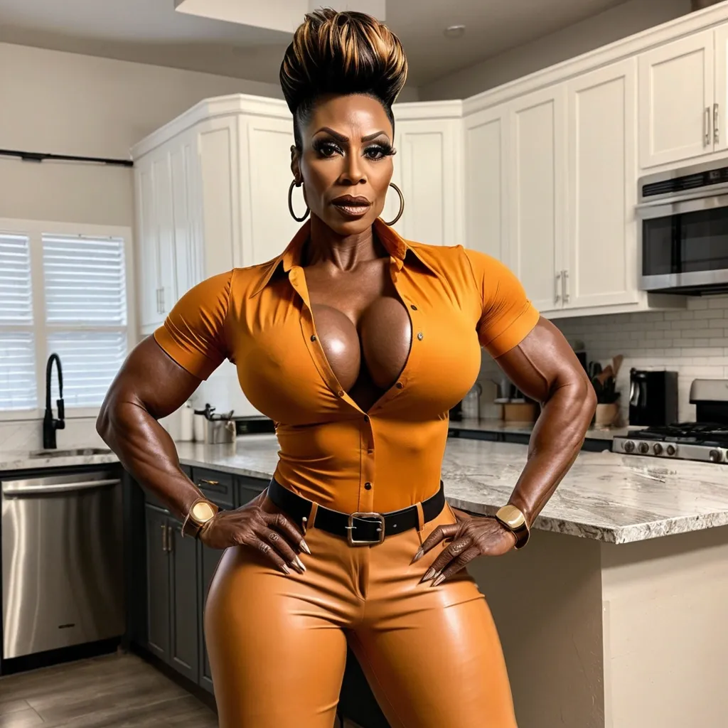 42 years old , dark-skinned African-American woman — extremely beautiful , with a presence that feels quietly dangerous and quietly royal at the same time. She has that soft glow in her skin that looks effortless , like she wakes up looking like this every day without trying , but everyone knows she still probably puts in discipline the old fashioned way. Her bone structure is model tier… cheekbones that could cut through pride , a jawline that says she doesn’t bend for just anybody , and soft lips that hold mystery and restraint all at once.Her futuristic hairdo , cropped close , styled in textured waves that shape her face like an artist’s finishing brush stroke. It gives her a striking , modern elegance — feminine , but with that slight edge that tells you she’s not the type anyone ever controls. Her eyebrows are naturally bold and shaped sharply , framing her honey hazel eyes that practically glow with their own weather system. Those eyes… you could lose a fight in those eyes before she ever speaks a word.She has luminous , glossy skin that reflects light like polished bronze catching early morning sun. Natural freckles sprinkle just lightly across her cheeks , softening the intimidation factor with a hint of youthful innocence. The way the light hits her face makes her look sculpted — like an ultra realistic painting brought to life. Everything about her looks intentional… but also like she was born this way.There’s also this quiet calm in her expression — not emotional weakness — but a poised , unshakeable stillness that only comes from knowing exactly who you are and not needing to defend it. She looks like the woman who never rushes into noise… she waits , she observes , she lets the room shift around her while she remains unmoved. That alone is power — and she wears it naturally like an old soul who understands her worth in ways other people are still scrambling to figure out , blonde short short futuristic pompadour hair , muscular body builder woman , , enormous breast , enormous buttThe low-cut top emphasizes her posture , drawing attention to her chest as she gazes directly ahead. standing in kitchen , enormous butt , , Enormous breast , facing camera , modest top , button up shirt , closed collar , modest collar orange , brown , and beige accent modest shirt , beige leather pants , closed collar top , yellow undershirt t-shirt ,