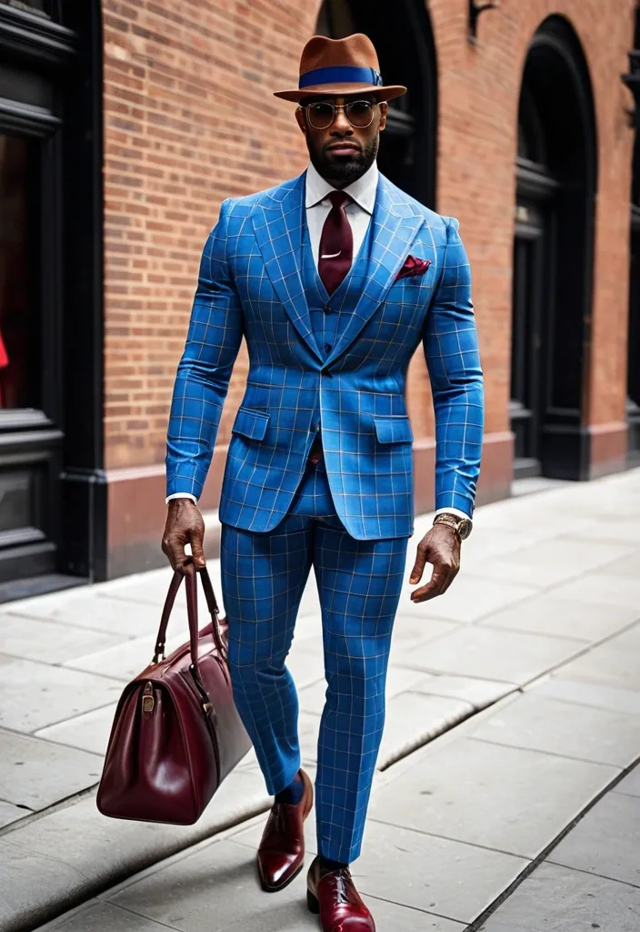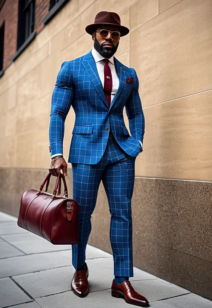 Generate ruggedly handsome dark-skinned African-American man abnormally massive male bodybuilder , , close up , full lips , big booty , black trimmed coarse hair , big , muscular man , brown strikingly intense and alluring eyes , up close , flexing biceps , beautiful brown eyes , legs are iconic and defining physical feature , both visually and in terms of combat ability.wearing an outfit that is a striking blend of elegance , power , and femininity , designed to command attention in any room. The suit is tailored to perfection , hugging the wearer’s curves with precision while emphasizing a structured silhouette. The fabric itself is a refined grey tweed patterned with subtle white grid lines , giving the suit a texture that feels both sophisticated and modern. The blazer features broad blue lapels and gold button accents , adding a luxurious touch that elevates the look beyond typical business attire. The matching high-waisted trousers elongate the frame , further enhancing the poised and commanding effect of the ensemble.The styling choices amplify the boldness of the suit. The inner shirt is a silky , greybutton-down shirt that complements the tweed’s tone while introducing a masculine balance to the sharp tailoring of the jacket. The shirt peeks out neatly from under the blazer , maintaining elegance without drawing focus away from the suit’s commanding cut. Accessories are kept minimal yet intentional: a delicate layered gold necklace ad alpha leader of light and luxury without overpowering the outfit completing the commanding visual.Altogether , this look communicates a blend of authority and allure. It is business-ready yet fashion-forward , balancing corporate structure with vibrant femininity. The color palette blue , grey and gold avoids being overly delicate , instead embracing the richness of texture , structure , and presence. This is the kind of ensemble that speaks to ambition , sophistication , and personal style—ideal for someone who thrives in positions of influence but insists on expressing her individuality with bold elegance. It’s not just clothing—it’s a statement of power wrapped in grace. In luxury living legs that could crush a watermelon , skirt high boots are a bold and striking statement piece , crafted in glossy black patent leather that gives them a sleek , polished finish. Rising to just below the knee , the boots feature three adjustable buckle straps along the shaft , adding both edge and detail to their design. The towering stiletto heel , paired with a thick platform sole , creates an ultra-dramatic silhouette that elongates the leg and exudes power and confidence. With their combination of shine , height , and structure , these boots perfectly balance fierce femininity with high-fashion allure , outfit is pure sartorial artistry — bold , calculated , and dripping with charisma. The man commands attention in a vivid sky-blue plaid three-piece suit that fuses classic tailoring with fearless modern flair. The suit’s pattern , consisting of clean checkered lines , brings a sense of rhythm and personality , while the cut emphasizes structure and refinement. Layered beneath is a crisp white shirt and a deep red-and-blue striped tie , perfectly harmonizing with the suit’s palette. Draped effortlessly over his shoulders is a camel-brown overcoat — a timeless power move that adds warmth , texture , and depth to the electric blue ensemble. The accessories elevate the look to a whole new level of sophistication. A wide-brimmed straw boater hat with a red-and-blue ribbon adds a vintage charm , nodding to 1920s dandy fashion while still feeling fresh and defiant. His round sunglasses and neatly groomed beard give him an aura of cool intellect and quiet dominance — the kind of man who doesn’t just wear fashion but controls it. A red pocket square tucked neatly into his blazer pocket echoes his tie and socks , proving this outfit isn’t loud by accident — it’s a symphony of coordination. Finishing the look are rich burgundy double monk-strap shoes paired with deep maroon socks — a daring yet cohesive choice that grounds the whole outfit with polish and maturity. The brown leather duffel bag beside him adds practicality while maintaining the tone of luxury. Altogether , this ensemble is more than just clothing — it’s a statement of identity , confidence , and culture. Every color , fabric , and accessory works in unison to express refined individuality and unshakable presence. ,