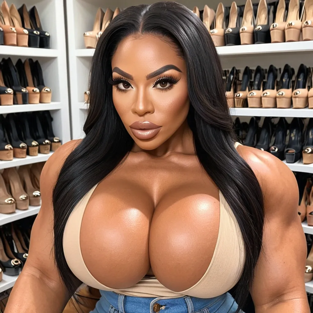Generate Gorgeous female boss , , bimbo , hourglass body , golden brown skim complexion. abnormally massive female bodybuilder , gorgeous , close up , full lips , big booty , black hair , biracial , African-American , and Philippine woman , black straight stylish hair , feminine silhouette , too big breast , big booty , sexy thighs abs , silhouette , up close , flexing biceps , beautiful brown eyes , legs are iconic and defining physical feature , both visually and in terms of combat ability.wearing an outfit that is a striking blend of elegance , power , and femininity , designed to command attention in any room. The suit is tailored to perfection , hugging the wearer’s curves with precision while emphasizing a structured silhouette. The fabric itself is a refined grey tweed patterned with subtle white grid lines , giving the suit a texture that feels both sophisticated and modern. The blazer features broad blue lapels and gold button accents , adding a luxurious touch that elevates the look beyond typical business attire. The matching high-waisted trousers elongate the frame , further enhancing the poised and commanding effect of the ensemble.The styling choices amplify the boldness of the suit. The inner blouse is a silky , greybutton-down shirt that complements the tweed’s tone while introducing a softer , feminine balance to the sharp tailoring of the jacket. The blouse peeks out neatly from under the blazer , maintaining elegance without drawing focus away from the suit’s commanding cut. Accessories are kept minimal yet intentional: a delicate layered gold necklace and hoop earrings that add glimmers of light and luxury without overpowering the outfit. The choice of voluminous , honey-brown braids cascading down her shoulders frames the face with both confidence and glamour , completing the commanding visual.Altogether , this look communicates a blend of authority and allure. It is business-ready yet fashion-forward , balancing corporate structure with vibrant femininity. The color palette blue , grey and gold avoids being overly delicate , instead embracing the richness of texture , structure , and presence. This is the kind of ensemble that speaks to ambition , sophistication , and personal style—ideal for someone who thrives in positions of influence but insists on expressing her individuality with bold elegance. It’s not just clothing—it’s a statement of power wrapped in grace. In luxury living legs that could crush a watermelon , skirt high boots are a bold and striking statement piece , crafted in glossy black patent leather that gives them a sleek , polished finish. Rising to just below the knee , the boots feature three adjustable buckle straps along the shaft , adding both edge and detail to their design. The towering stiletto heel , paired with a thick platform sole , creates an ultra-dramatic silhouette that elongates the leg and exudes power and confidence. With their combination of shine , height , and structure , these boots perfectly balance fierce femininity with high-fashion allure. High cheekbones , prominent jawline , gorgeous big brown eyes , powerful curves , enormous breast , sitting beige tank top , blue jean shorts , voluptuous , inside nail saloon up close shot , ,