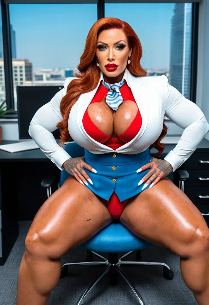 Generate Gorgeous female boss , 34 years old , bimbo , hourglass body , abnormally massive female bodybuilder , gorgeous , close up , full lips , big booty , redheaded , freckles on face and breast , 1940s styled hair , feminine silhouette , too big breast , big booty , sexy thighs abs , silhouette , up close , flexing biceps , beautiful green eyes , legs are iconic and defining physical feature , both visually and in terms of combat ability.wearing an outfit that is a striking blend of elegance , power , and femininity , designed to command attention in any room. The suit is tailored to perfection , hugging the wearer’s curves with precision while emphasizing a structured silhouette. The fabric itself is a refined grey tweed patterned with subtle white grid lines , giving the suit a texture that feels both sophisticated and modern. The blazer features broad blue lapels and gold button accents , adding a luxurious touch that elevates the look beyond typical business attire. The matching high-waisted trousers elongate the frame , further enhancing the poised and commanding effect of the ensemble.The styling choices amplify the boldness of the suit. The inner blouse is a silky , greybutton-down shirt that complements the tweed’s tone while introducing a softer , feminine balance to the sharp tailoring of the jacket. The blouse peeks out neatly from under the blazer , maintaining elegance without drawing focus away from the suit’s commanding cut. Accessories are kept minimal yet intentional: a delicate layered gold necklace and hoop earrings that add glimmers of light and luxury without overpowering the outfit. The choice of voluminous , honey-brown braids cascading down her shoulders frames the face with both confidence and glamour , completing the commanding visual.Altogether , this look communicates a blend of authority and allure. It is business-ready yet fashion-forward , balancing corporate structure with vibrant femininity. The color palette blue , grey and gold avoids being overly delicate , instead embracing the richness of texture , structure , and presence. This is the kind of ensemble that speaks to ambition , sophistication , and personal style—ideal for someone who thrives in positions of influence but insists on expressing her individuality with bold elegance. It’s not just clothing—it’s a statement of power wrapped in grace. In luxury living legs that could crush a watermelon , skirt high boots are a bold and striking statement piece , crafted in glossy black patent leather that gives them a sleek , polished finish. Rising to just below the knee , the boots feature three adjustable buckle straps along the shaft , adding both edge and detail to their design. The towering stiletto heel , paired with a thick platform sole , creates an ultra-dramatic silhouette that elongates the leg and exudes power and confidence. With their combination of shine , height , and structure , these boots perfectly balance fierce femininity with high-fashion allure. Enormous breast , small waist , enormous butt , sky blue blazer , white high collar blouse t-shirt , gold got tie necklace , sky blue blazer , sky blue skirt , sitting in cubicle at work , massive cleavage , enormous butt , sitting next to muscular African-American man wearing white shirt and red tie and grey slacks ,