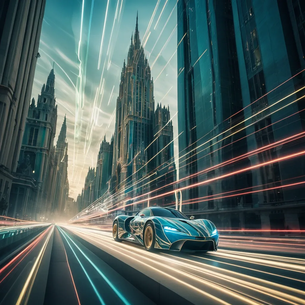 A Light Trail Chromatic Aberration of Hulk , where the light trails split into their component colors , creating a vibrant and distorted effect , embodying the dynamism of the machine age. Metallic hues of chrome and cobalt blue dominate , dashing at incredible speed across a train track suspended between two towering buildings depicted with motion blur emphasizing the subject's incredible velocity and forward momentum ,