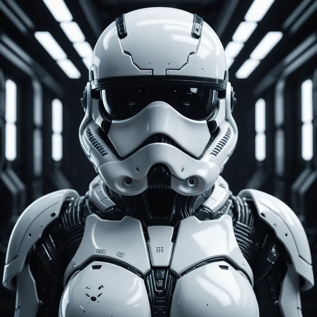 Storm trooper /// photo , portrait style , symmetrical face front view , hyperrealistic render metal details , beautiful portrait of storm trooper with bio-mechanic suit , high contrast , 8k photographic style , matte painting , octane render , ambiant light , ghost in the shell , blured background , ,