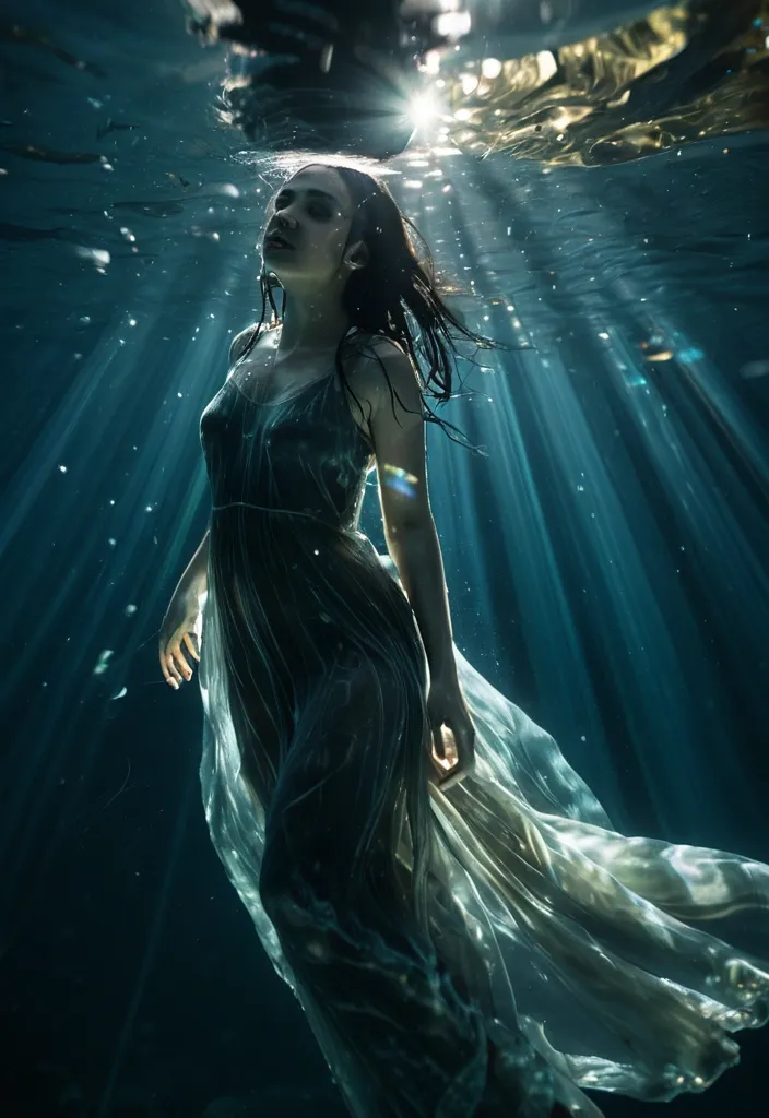 Underwater series ///High detail RAW color professional photo , very detailed face: 1.4 , a detailed portrait of a woman floating underwater in a long flowing dress , nymph style , amazing underwater , detailed skin , wet clothes , wet and black hair , transparent clothing , lens flare , shadow , tindal effect , lens flare , backlight , bokeh ,