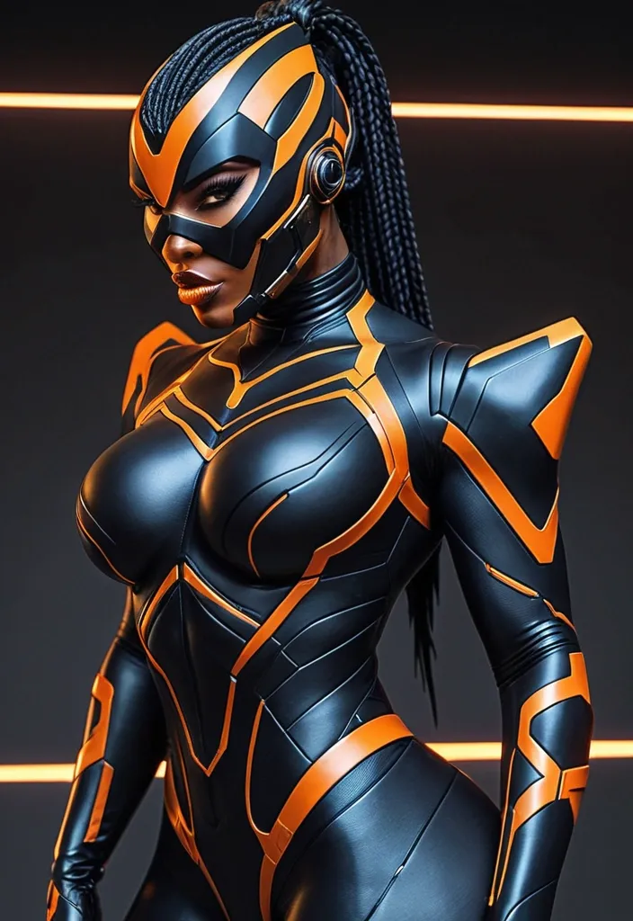 Generate Gorgeous 24 years old , female boss , dark-skinned African-American woman , pointy face , bimbo , hourglass body , abnormally massive female bodybuilder , gorgeous , close up , full lips , big booty , braided styled Mohawk , bald on the side , feminine silhouette , too big breast , big booty , sexy thighs abs , silhouette , up close , flexing biceps , beautiful brown eyes , legs are iconic and defining physical feature , both visually and in terms of combat ability.wearing an outfit that is a striking blend of elegance , power , and femininity , designed to command attention in any room. The suit is tailored to perfection , hugging the wearer’s curves with precision while emphasizing a structured silhouette. The fabric itself is a refined grey tweed patterned with subtle white grid lines , giving the suit a texture that feels both sophisticated and modern. The blazer features broad blue lapels and gold button accents , adding a luxurious touch that elevates the look beyond typical business attire. The matching high-waisted trousers elongate the frame , further enhancing the poised and commanding effect of the ensemble.The styling choices amplify the boldness of the suit. The inner blouse is a silky , greybutton-down shirt that complements the tweed’s tone while introducing a softer , feminine balance to the sharp tailoring of the jacket. The blouse peeks out neatly from under the blazer , maintaining elegance without drawing focus away from the suit’s commanding cut. Accessories are kept minimal yet intentional: a delicate layered gold necklace and hoop earrings that add glimmers of light and luxury without overpowering the outfit. The choice of voluminous , honey-brown braids cascading down her shoulders frames the face with both confidence and glamour , completing the commanding visual.Altogether , this look communicates a blend of authority and allure. It is business-ready yet fashion-forward , balancing corporate structure with vibrant femininity. The color palette blue , grey and gold avoids being overly delicate , instead embracing the richness of texture , structure , and presence. This is the kind of ensemble that speaks to ambition , sophistication , and personal style—ideal for someone who thrives in positions of influence but insists on expressing her individuality with bold elegance. It’s not just clothing—it’s a statement of power wrapped in grace. In luxury living legs that could crush a watermelon , skirt high boots are a bold and striking statement piece , crafted in glossy black patent leather that gives them a sleek , polished finish. Rising to just below the knee , the boots feature three adjustable buckle straps along the shaft , adding both edge and detail to their design. The towering stiletto heel , paired with a thick platform sole , creates an ultra-dramatic silhouette that elongates the leg and exudes power and confidence. With their combination of shine , height , and structure , these boots perfectly balance fierce femininity with high-fashion allure. High cheekbones , prominent jawline , gorgeous big brown light hazel honey , , enormous breast , enormous butt , Lady Onyx wears a sleek , second-skin black tactical suit crafted from a high-tech matte material that clings to her massively muscled yet curvaceous frame like liquid obsidian. Subtle orange-gold circuit-like lines trace along her shoulders , spine , and hips , glowing faintly and accentuating every exaggerated contour of her physique. The suit features a high collar and integrated gloves , with angular armored segments over the shoulders and a streamlined helmet-mask that leaves her mouth exposed while her glowing eyes peer through a predatory visor. Overall , the design fuses futuristic cyber-ninja aesthetics with superhero functionality , projecting lethal elegance and unstoppable power. Enormous breast , enormous butt , black and orange half mask , leaving mouth and braided hair , and white eyes exposed , ,