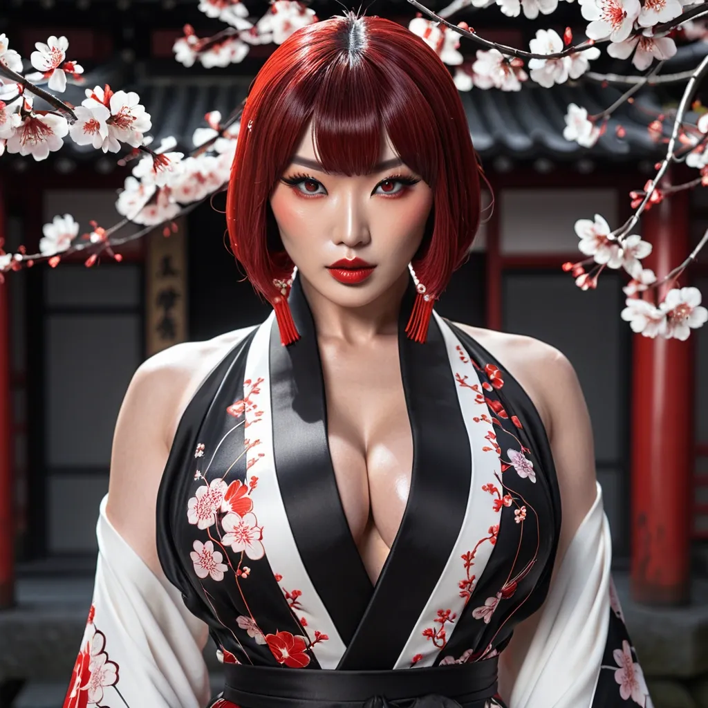 Generate Gorgeous female boss , Japanese woman , pointy face , bimbo , hourglass body , abnormally massive female bodybuilder , gorgeous , close up , full lips , big booty , red hair breast , bob-cut , bangs cover forhead design hair , feminine silhouette , too big breast , big booty , sexy thighs abs , silhouette , up close , flexing biceps , beautiful green eyes , legs are iconic and defining physical feature , both visually and in terms of combat ability.wearing an outfit that is a striking blend of elegance , power , and femininity , designed to command attention in any room. The suit is tailored to perfection , hugging the wearer’s curves with precision while emphasizing a structured silhouette. The fabric itself is a refined grey tweed patterned with subtle white grid lines , giving the suit a texture that feels both sophisticated and modern. The blazer features broad blue lapels and gold button accents , adding a luxurious touch that elevates the look beyond typical business attire. The matching high-waisted trousers elongate the frame , further enhancing the poised and commanding effect of the ensemble.The styling choices amplify the boldness of the suit. The inner blouse is a silky , greybutton-down shirt that complements the tweed’s tone while introducing a softer , feminine balance to the sharp tailoring of the jacket. The blouse peeks out neatly from under the blazer , maintaining elegance without drawing focus away from the suit’s commanding cut. Accessories are kept minimal yet intentional: a delicate layered gold necklace and hoop earrings that add glimmers of light and luxury without overpowering the outfit. The choice oframes the face with both confidence and glamour , completing the commanding visual.Altogether , this look communicates a blend of authority and allure. It is business-ready yet fashion-forward , balancing corporate structure with vibrant femininity. The color palette blue , grey and gold avoids being overly delicate , instead embracing the richness of texture , structure , and presence. This is the kind of ensemble that speaks to ambition , sophistication , and personal style—ideal for someone who thrives in positions of influence but insists on expressing her individuality with bold elegance. It’s not just clothing—it’s a statement of power wrapped in grace. In luxury living legs that could crush a watermelon , skirt high boots are a bold and striking statement piece , crafted in glossy black patent leather that gives them a sleek , polished finish. Rising to just below the knee , the boots feature three adjustable buckle straps along the shaft , adding both edge and detail to their design. The towering stiletto heel , paired with a thick platform sole , creates an ultra-dramatic silhouette that elongates the leg and exudes power and confidence. With their combination of shine , height , and structure , these boots perfectly balance fierce femininity with high-fashion allure. Gorgeous brown eyes , nose ring , big lips glossy lips , The woman is wearing a revealing , form-fitting outfit that blends traditional East Asian elements with a modern , provocative style. Her top consists of a deep black halter-like garment with a high mandarin collar fastened by red frog buttons , layered beneath an open white robe adorned with intricate red and black cherry blossom (sakura) branches and flowers , evoking classic Japanese kimono motifs. The robe drapes loosely over her shoulders and arms , parting dramatically in the front to expose a plunging neckline and emphasize her ample cleavage. The fabric appears luxurious and slightly glossy , with the white sections contrasting sharply against the black inner layer , while subtle red accents in the floral patterns and buttons add a touch of elegance and sensuality to the overall ensemble. enormous breast , enormous butt ,