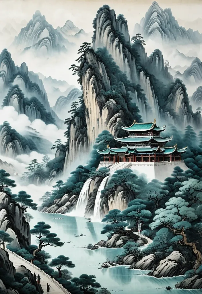 This is a typical court painting in the style of Wang Ximeng from the Northern Song Dynasty around 1000 AD , rendered in the blue-green landscape style , with exquisite and high-quality mounting. At the center of the painting is a majestic mountain , with continuous mountain ranges on both sides and in the distance. At the foot of the mountain , a stream meanders , and two monks are crossing a small bridge over it. A faint path winds its way up the mountain , sometimes disappearing into the clouds , sometimes suddenly appearing before the eaves of a temple half-hidden by the massive mountain , where monks are entering the temple gate. The surrounding mountains are steep and imposing , with several pine trees growing on the cliffs , blocking the early morning sun. The mountaintop is almost entirely covered by clouds , yet through gaps in the mist , a corner of a pure white jade palace , seemingly a celestial palace , is visible , with cranes appearing to fly nearby in the clouds. The exaggerated composition of this Chinese painting creates a sense of contrast between the human world and the celestial realm , from the foot of the mountain to the summit. Vertical 9:16 , ultra-high definition. ,