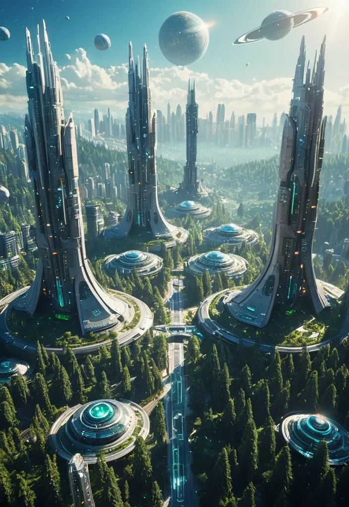 photorealistic , full length , a futuristic luminous city with harmonious buildings and trees all in the city , some futuristic flying cars and shuttles on sky between towers , on a forest palnet , a beatuful european female wavy shouldr brown hair in her mid thirties , in blue space open zipper swimsuit at first plan , standing on a balcony , sunny afternoon , cinematic science fiction style ,
