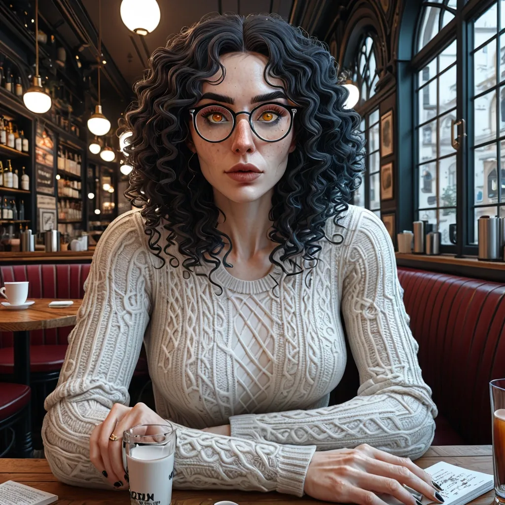 adult , (pale sleep deprived geek girl) , (pale) , (sleep deprivation) , circles under the eyes , panda eyes , ((curly hair , )) wearing glasses and sweater dress , perfect face , ((detailed eyes)) , (( detailed pupils)) , slightly muscular , fit , full body shot , sitting in a cafe , intricate , detailed , (line art) , insanely high res , 8K , HD , ((WLOP)) , rossdraws , artgerm , (((vivid colors))) , Chaïm Soutine , , Felix Octavius Carr Darley ,