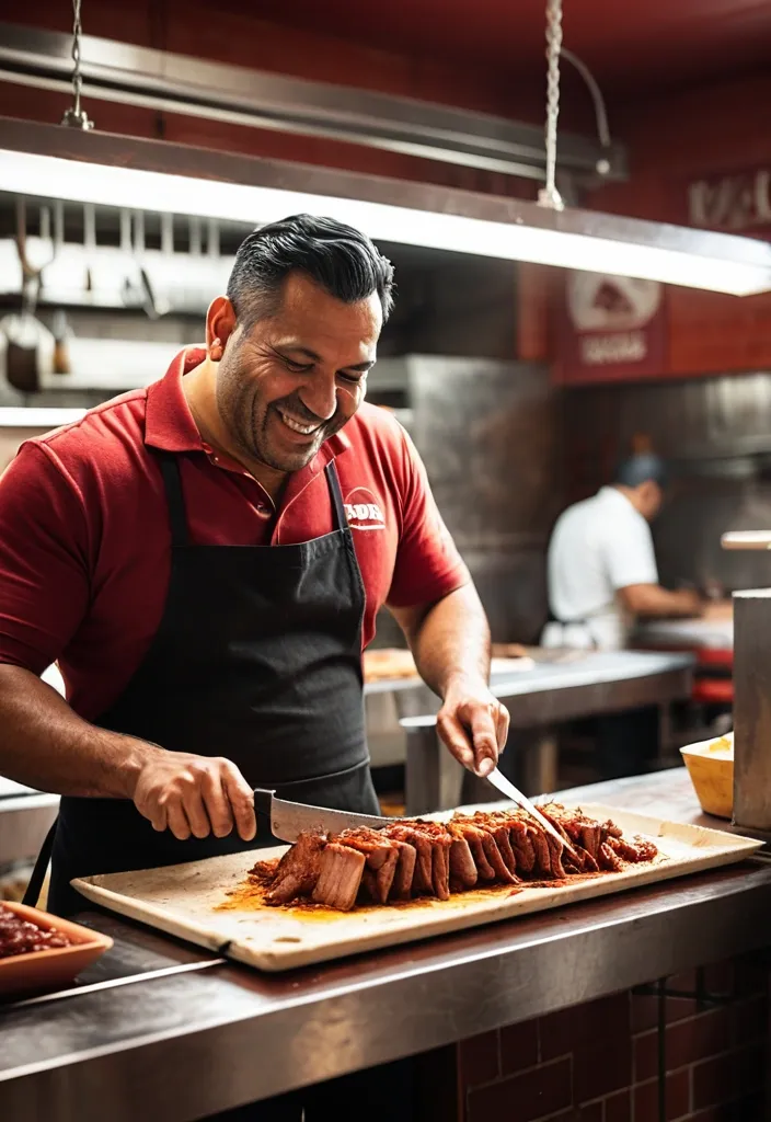 Realistic commercial photograph of a smiling Mexican taquero slicing al pastor meat from a vertical spit in a small taqueria. Warm , natural light , shallow depth of field. The taquero wears a red polo shirt and black apron , holding a large knife and fork as he slices the meat onto a metal tray. The background shows seated , slightly out-of-focus customers looking at their cell phones. The atmosphere feels authentic , informal , and warm , with tiled walls and wooden tables. High level of detail , soft cinematic tones , sharp subject , and natural textures. ,