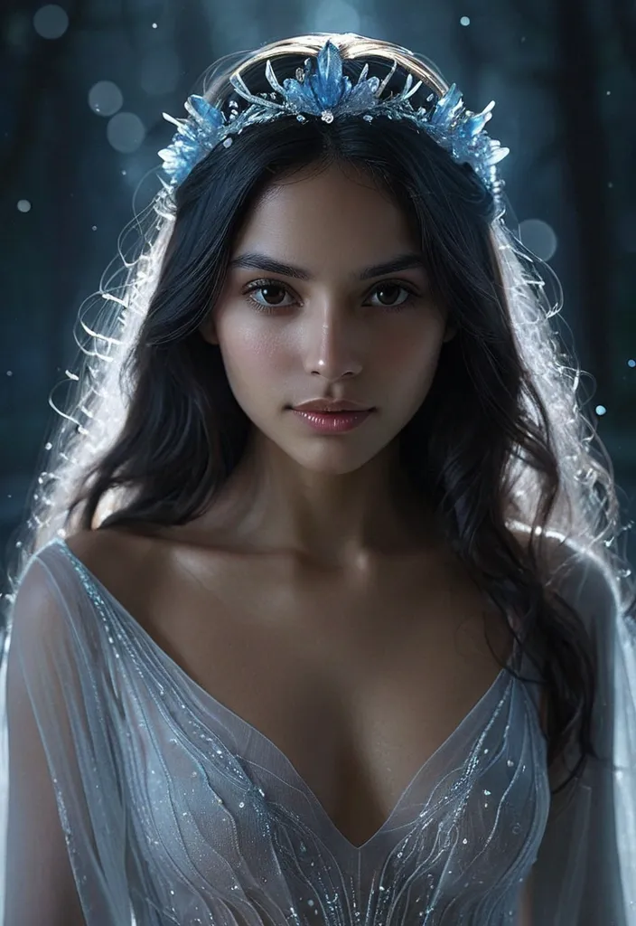 A hyperrealistic , 8K ultra-high-definition , cinematic portrait of an unimaginably beautiful Hispanic woman , focusing on her upper body. Her ethereal beauty transcends earthly realism , embodying both pure innocence and profound , captivating sensuality , making her seem almost divine. Facial Features: Her flawless Hispanic face possesses perfectly symmetrical , delicate yet strong contours. Her eyes are large , captivating blue , crystal-clear , and intensely expressive , holding a mysterious , serene gaze that radiates both ancient wisdom and untouched innocence. They sparkle with an otherworldly luminescence , drawing the viewer into their depth. Her lips are full , naturally rosy , and subtly curved into a gentle , enigmatic smile that conveys both purity and a soft , alluring charm. Her nose and cheekbones reflect classic Hispanic elegance , rendered with breathtaking detail. Hair: Long , luxurious , dark hair (e.g. , rich , glossy black or deep , wavy brown with subtle reddish undertones typical of Hispanic features) cascades softly over her shoulders and upper back. It subtly glows or shimmers with an ethereal light , as if kissed by moonlight or starlight , creating a delicate , magical halo effect around her head. The texture is incredibly detailed , showing individual strands yet maintaining a soft , dreamlike quality. Skin Tone & Texture: Her skin is utterly flawless , impossibly smooth , and possesses a radiant , sun-kissed luminosity that appears to emit a soft , pearlescent glow , characteristic of exquisite Hispanic complexions. Every pore , subtle blush , and minute detail is rendered with photorealistic precision , yet it retains a dreamlike , almost translucent quality that hints at her fantastical origin. Attire & Form: She wears an elegant , flowing garment made of ethereal , perhaps shimmering , silk or a translucent , delicate fabric that drapes softly over her shoulders and décolletage. The attire subtly enhances her graceful silhouette without overt exposure , embodying refined sensuality. The fabric might gently glow or reflect soft , muted colors. Her posture is serene and elegant , exuding innate grace and a quiet power. Lighting & Atmosphere: Bathed in soft , diffused , magical lighting that originates from an unseen , fantastical source (e.g. , gentle starlight filtering through clouds , the soft glow of an enchanted forest , or an otherworldly aurora borealis). This sublime lighting sculpts her features perfectly , casting delicate , artistic shadows that emphasize her otherworldly beauty. The background is minimalistic and softly blurred , composed of swirling , luminous colors or faint , indistinct fantastical elements (e.g. , distant , soft cosmic dust , abstract light patterns) , ensuring the primary focus remains entirely on her captivating and impossibly beautiful presence. The overall atmosphere is one of profound serenity , divine grace , and wondrous fantasy , akin to seeing a living masterpiece from an ancient myth. ,