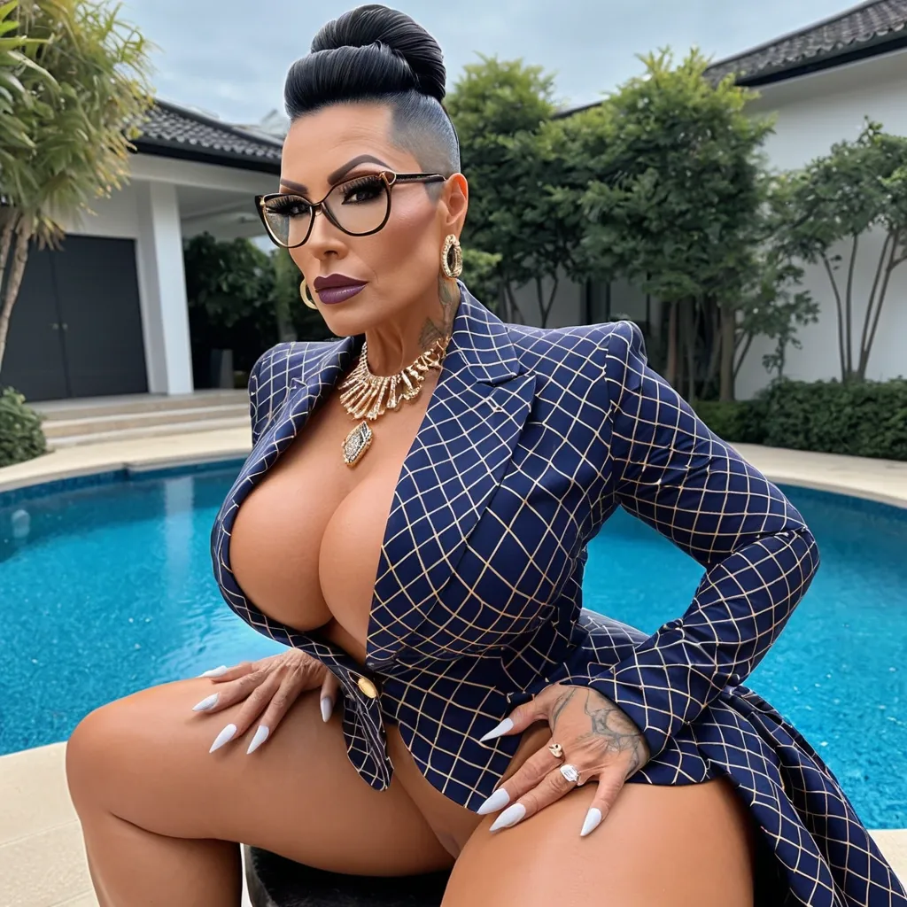 Generate Gorgeous female boss , bimbo , dark-skinned very African-American female , hourglass body , abnormally massive female bodybuilder , gorgeous , close up , full lips , big booty , brown , on face and breast , ponytail , , shaved on the side , feminine silhouette , too big breast , big booty , sexy thighs abs , silhouette , up close , flexing biceps , beautiful green eyes , legs are iconic and defining physical feature , both visually and in terms of combat ability.wearing an outfit that is a striking blend of elegance , power , and femininity , designed to command attention in any room. The suit is tailored to perfection , hugging the wearer’s curves with precision while emphasizing a structured silhouette. The fabric itself is a refined grey tweed patterned with subtle white grid lines , giving the suit a texture that feels both sophisticated and modern. The blazer features broad blue lapels and gold button accents , adding a luxurious touch that elevates the look beyond typical business attire. The matching high-waisted trousers elongate the frame , further enhancing the poised and commanding effect of the ensemble.The styling choices amplify the boldness of the suit. The inner blouse is a silky , greybutton-down shirt that complements the tweed’s tone while introducing a softer , feminine balance to the sharp tailoring of the jacket. The blouse peeks out neatly from under the blazer , maintaining elegance without drawing focus away from the suit’s commanding cut. Accessories are kept minimal yet intentional: a delicate layered gold necklace and hoop earrings that add glimmers of light and luxury without overpowering the outfit. The choice of voluminous , honey-brown braids cascading down her shoulders frames the face with both confidence and glamour , completing the commanding visual.Altogether , this look communicates a blend of authority and allure. It is business-ready yet fashion-forward , balancing corporate structure with vibrant femininity. The color palette blue , grey and gold avoids being overly delicate , instead embracing the richness of texture , structure , and presence. This is the kind of ensemble that speaks to ambition , sophistication , and personal style—ideal for someone who thrives in positions of influence but insists on expressing her individuality with bold elegance. It’s not just clothing—it’s a statement of power wrapped in grace. In luxury living legs that could crush a watermelon , skirt high boots are a bold and striking statement piece , crafted in glossy black patent leather that gives them a sleek , polished finish. Rising to just below the knee , the boots feature three adjustable buckle straps along the shaft , adding both edge and detail to their design. The towering stiletto heel , paired with a thick platform sole , creates an ultra-dramatic silhouette that elongates the leg and exudes power and confidence. With their combination of shine , height , and structure , these boots perfectly balance fierce femininity with high-fashion allure. High cheekbones , prominent jawline , gorgeous big light reflecting hazel eyes , enormous breast , cartoon bunny on white t-shirt , denim overalls shorts , denim shorts , in backyard working on garden ,
