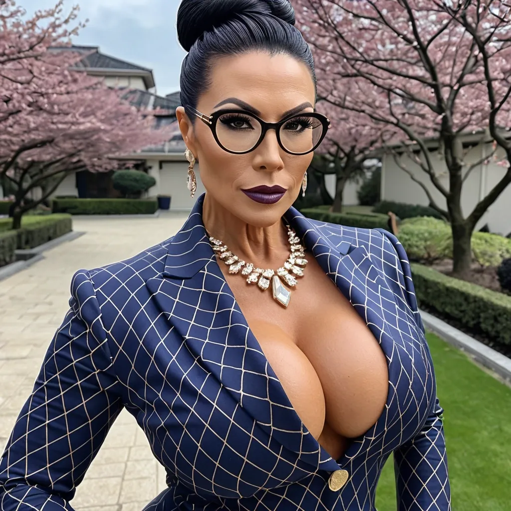 Generate Gorgeous female boss , bimbo , hourglass body , abnormally massive female bodybuilder , gorgeous , close up , full lips , big booty , redheaded , freckles on face and breast , braided design hair , feminine silhouette , too big breast , big booty , sexy thighs abs , silhouette , up close , flexing biceps , beautiful green eyes , legs are iconic and defining physical feature , both visually and in terms of combat ability.wearing an outfit that is a striking blend of elegance , power , and femininity , designed to command attention in any room. The suit is tailored to perfection , hugging the wearer’s curves with precision while emphasizing a structured silhouette. The fabric itself is a refined grey tweed patterned with subtle white grid lines , giving the suit a texture that feels both sophisticated and modern. The blazer features broad blue lapels and gold button accents , adding a luxurious touch that elevates the look beyond typical business attire. The matching high-waisted trousers elongate the frame , further enhancing the poised and commanding effect of the ensemble.The styling choices amplify the boldness of the suit. The inner blouse is a silky , greybutton-down shirt that complements the tweed’s tone while introducing a softer , feminine balance to the sharp tailoring of the jacket. The blouse peeks out neatly from under the blazer , maintaining elegance without drawing focus away from the suit’s commanding cut. Accessories are kept minimal yet intentional: a delicate layered gold necklace and hoop earrings that add glimmers of light and luxury without overpowering the outfit. The choice of voluminous , honey-brown braids cascading down her shoulders frames the face with both confidence and glamour , completing the commanding visual.Altogether , this look communicates a blend of authority and allure. It is business-ready yet fashion-forward , balancing corporate structure with vibrant femininity. The color palette blue , grey and gold avoids being overly delicate , instead embracing the richness of texture , structure , and presence. This is the kind of ensemble that speaks to ambition , sophistication , and personal style—ideal for someone who thrives in positions of influence but insists on expressing her individuality with bold elegance. It’s not just clothing—it’s a statement of power wrapped in grace. In luxury living legs that could crush a watermelon , skirt high boots are a bold and striking statement piece , crafted in glossy black patent leather that gives them a sleek , polished finish. Rising to just below the knee , the boots feature three adjustable buckle straps along the shaft , adding both edge and detail to their design. The towering stiletto heel , paired with a thick platform sole , creates an ultra-dramatic silhouette that elongates the leg and exudes power and confidence. With their combination of shine , height , and structure , these boots perfectly balance fierce femininity with high-fashion allure.brown , and yellow flora t-shirt ,