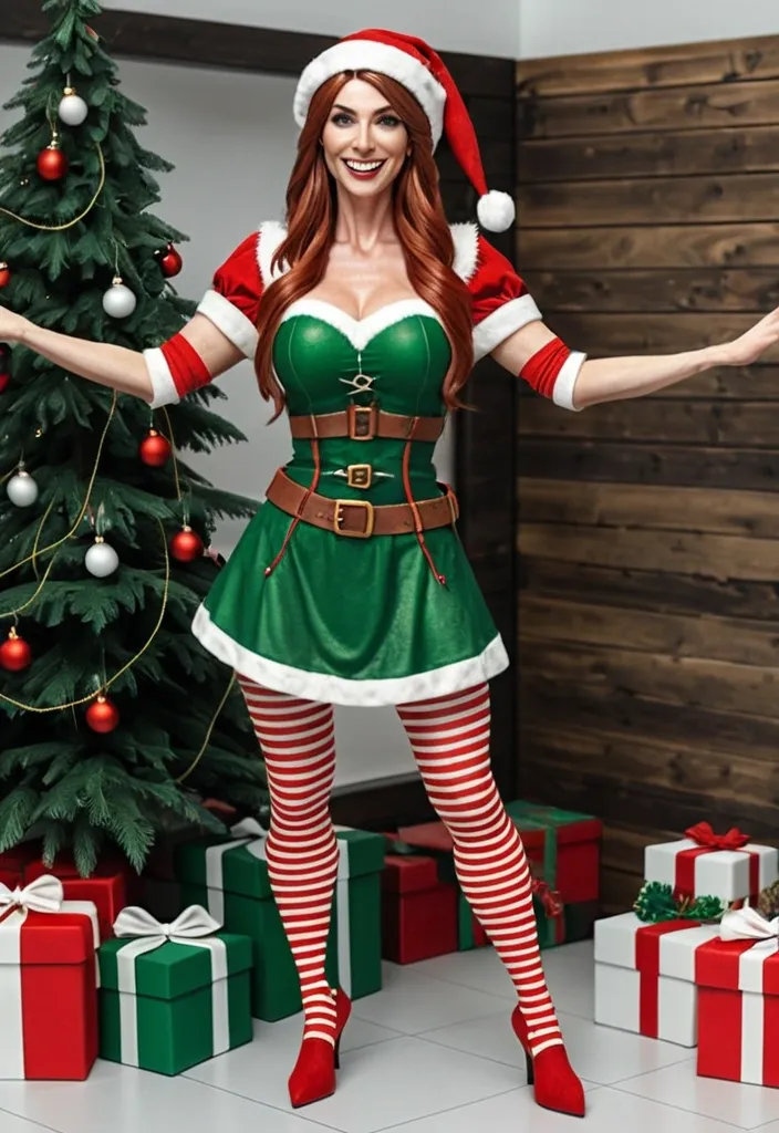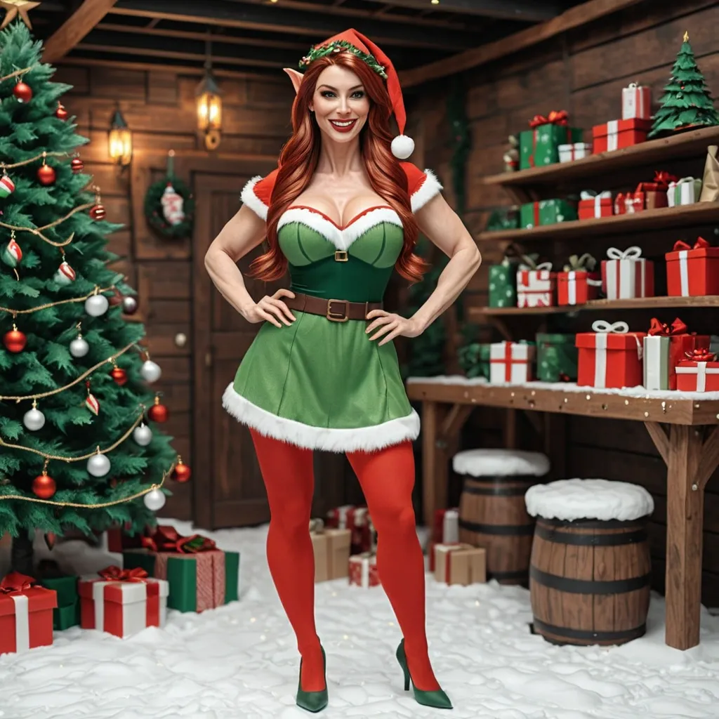 Generate Gorgeous female boss , bimbo , Japanese woman , , hourglass body , abnormally massive female bodybuilder , gorgeous , close up , full lips , big booty , red hair , bob-cut , short hair , feminine silhouette , too big breast , big booty , sexy thighs abs , silhouette , up close , flexing biceps , beautiful brown eyes , legs are iconic and defining physical feature , both visually and in terms of combat ability.wearing an outfit that is a striking blend of elegance , power , and femininity , designed to command attention in any room. The suit is tailored to perfection , hugging the wearer’s curves with precision while emphasizing a structured silhouette. The fabric itself is a refined grey tweed patterned with subtle white grid lines , giving the suit a texture that feels both sophisticated and modern. The blazer features broad blue lapels and gold button accents , adding a luxurious touch that elevates the look beyond typical business attire. The matching high-waisted trousers elongate the frame , further enhancing the poised and commanding effect of the ensemble.The styling choices amplify the boldness of the suit. The inner blouse is a silky , greybutton-down shirt that complements the tweed’s tone while introducing a softer , feminine balance to the sharp tailoring of the jacket. The blouse peeks out neatly from under the blazer , maintaining elegance without drawing focus away from the suit’s commanding cut. Accessories are kept minimal yet intentional: a delicate layered gold necklace and hoop earrings that add glimmers of light and luxury without overpowering the outfit. The choice of voluminous , honey-brown braids cascading down her shoulders frames the face with both confidence and glamour , completing the commanding visual.Altogether , this look communicates a blend of authority and allure. It is business-ready yet fashion-forward , balancing corporate structure with vibrant femininity. The color palette blue , grey and gold avoids being overly delicate , instead embracing the richness of texture , structure , and presence. This is the kind of ensemble that speaks to ambition , sophistication , and personal style—ideal for someone who thrives in positions of influence but insists on expressing her individuality with bold elegance. It’s not just clothing—it’s a statement of power wrapped in grace. In luxury living legs that could crush a watermelon , skirt high boots are a bold and striking statement piece , crafted in glossy black patent leather that gives them a sleek , polished finish. Rising to just below the knee , the boots feature three adjustable buckle straps along the shaft , adding both edge and detail to their design. The towering stiletto heel , paired with a thick platform sole , creates an ultra-dramatic silhouette that elongates the leg and exudes power and confidence. With their combination of shine , height , and structure , these boots perfectly balance fierce femininity with high-fashion allure. High cheekbones , prominent jawline , gorgeous big enormous breast , enormous butt , up close massive cleavage , The mix of leather , fur , jewelry , and structured straps signals confidence , control , and presentation.•Every element is meant to be seen; nothing about the outfit suggests movement or utility.In plain terms:She’s dressed in a carefully constructed , high-impact outfit that blends luxury textures and exposed structure , designed to project presence and visual authority rather than comfort or everyday use. Enormous breast , enormous butt ,