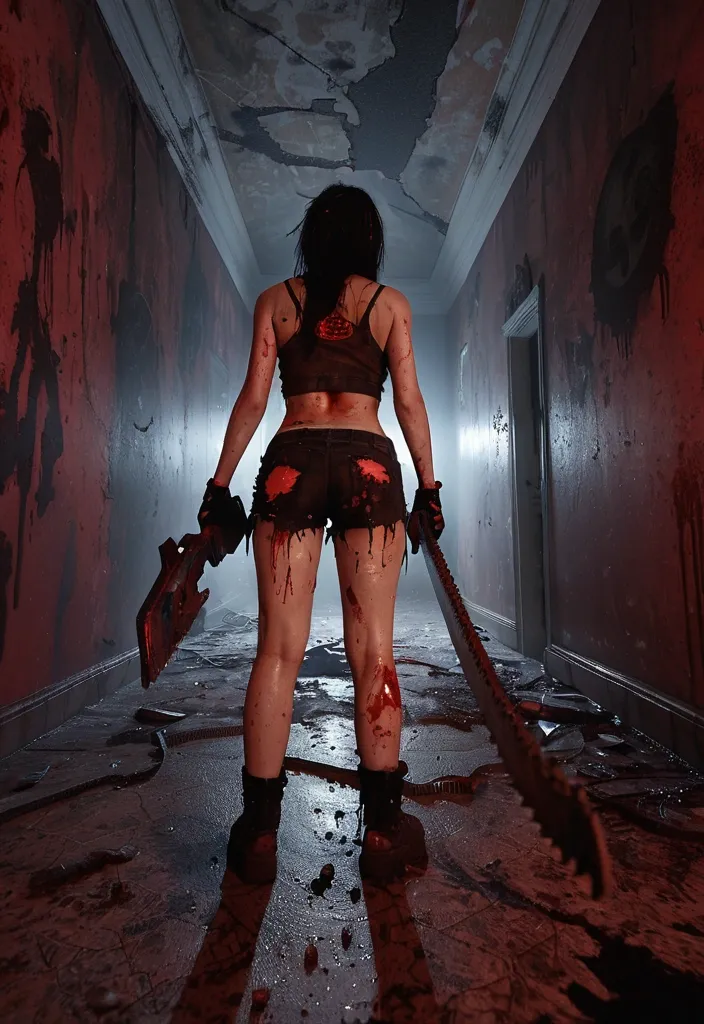 From behind of a Female figure standing sideway wearing a cracked , bloodstained porcelain hockey mask with Torn tank top and ripped hot-pants smeared with blood and grime , pale strong thighs. Holding a large blood-splattered chainsaw , angled menacingly. Abandoned castle corridor , flickering overhead red lights , rusted paintings with blood red mandala , peeling walls with puffing dust , scattered chains and debris , many blood trails on floor , dark fog curling around her feet. Dynamic low-angle composition , cinematic lighting , deep shadows contrasted with harsh highlights , hyper-detailed textures , grotesque and macabre , survival horror atmosphere , nightmarish , intensely creepy. ,