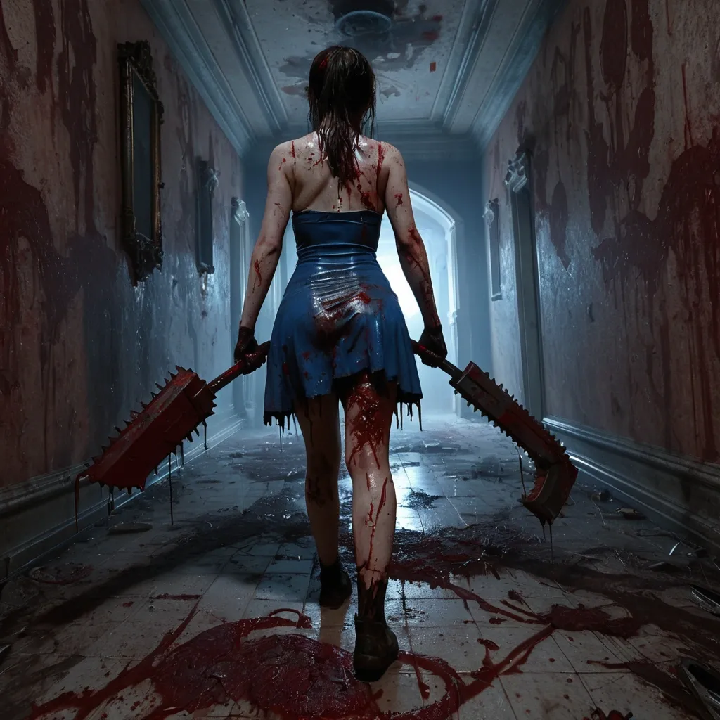 From behind of a Female figure running while Holding a large blood-splattered chainsaw. She is wearing a cracked , bloodstained porcelain mask with Torn form-fitting blue latex short dress smeared with blood and grime , pale strong thighs running in Abandoned castle corridor , flickering overhead red candles , rusted paintings with blood crimson mandala , peeling walls with puffing dust , scattered chains and debris , many blood trails on floor , dark fog curling around her feet. Dynamic low-angle composition , cinematic lighting , deep shadows contrasted with harsh highlights , hyper-detailed textures , grotesque and macabre , survival horror atmosphere , nightmarish , intensely creepy. ,