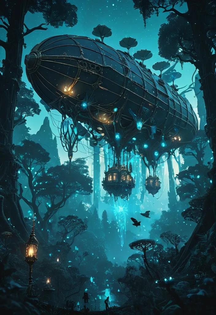 An ancient , bioluminescent forest at twilight , with ethereal creatures flitting between giant , crystalline trees. A lone , steampunk-inspired airship hovers silently above the canopy , its silhouette stark against the glowing flora. The atmosphere is one of profound mystery and forgotten magic. Rendered in a detailed digital painting style with 8k resolution and cinematic lighting. ,