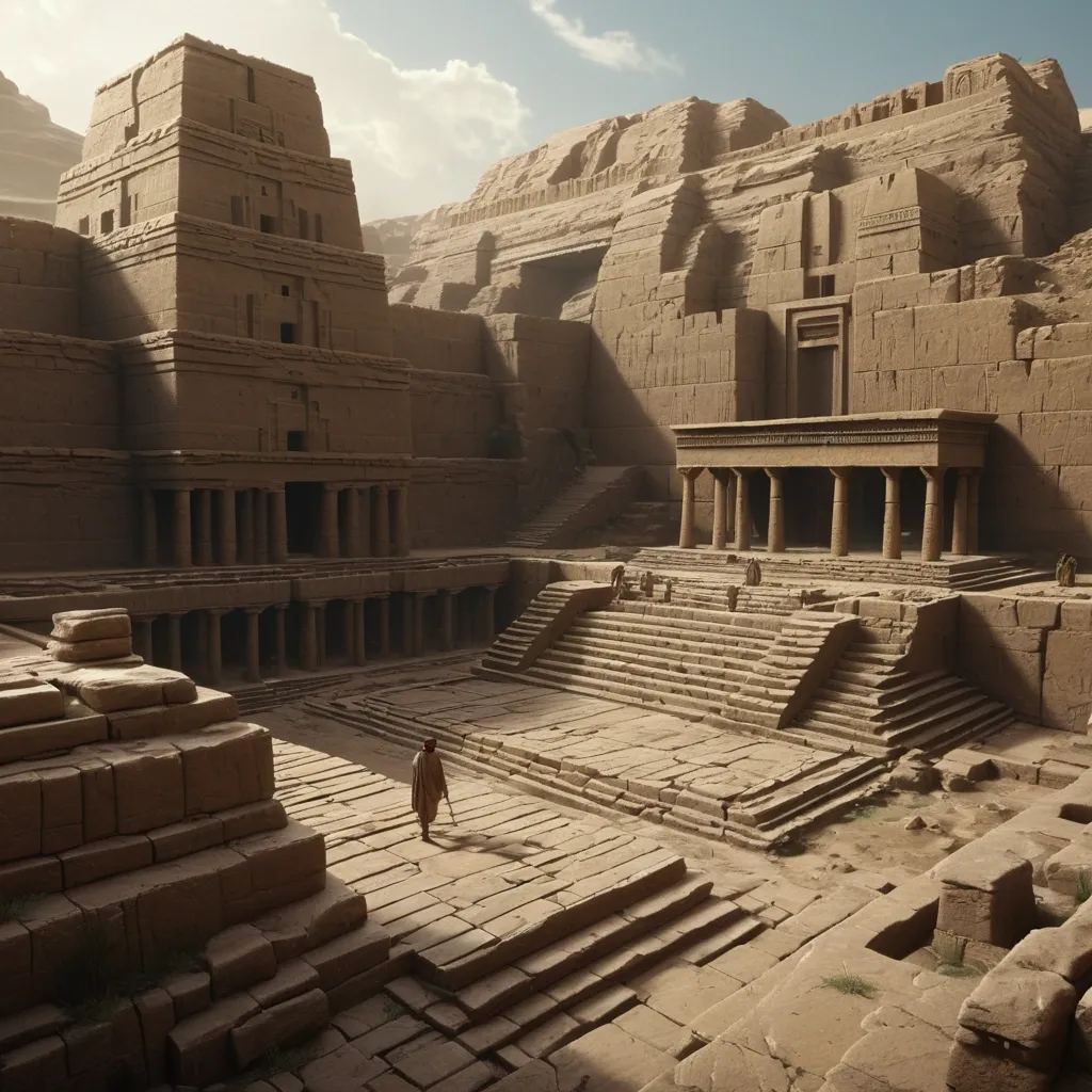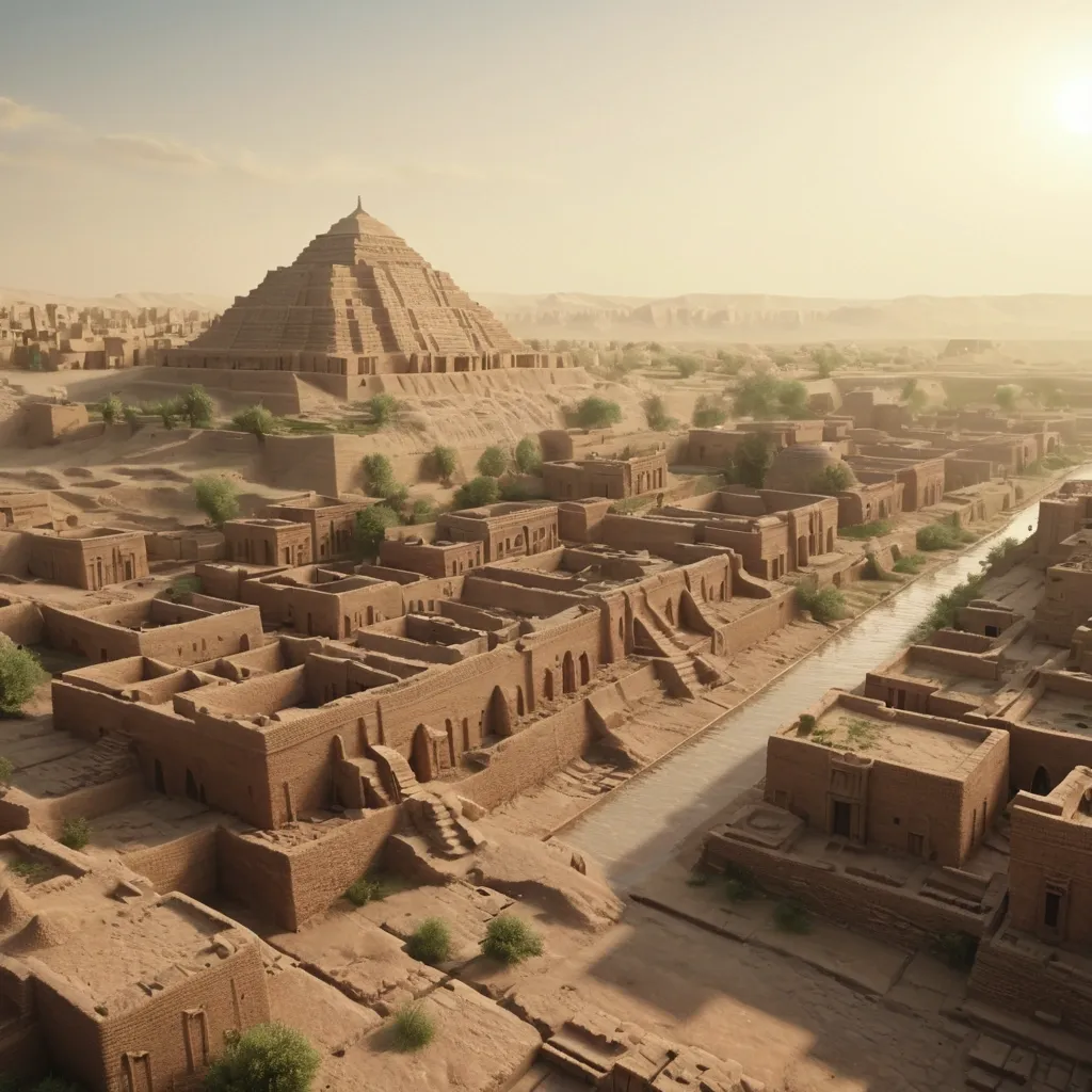 Shuruppak , early Sumerian city before the Flood , broad mud-brick streets and canals beside the Euphrates , low houses clustered around a rising temple mound , warm haze in late morning , early summer , Style: Matte Painting , detailed and atmospheric with subtle depth of field , Wide view , Side View , 4K. ,