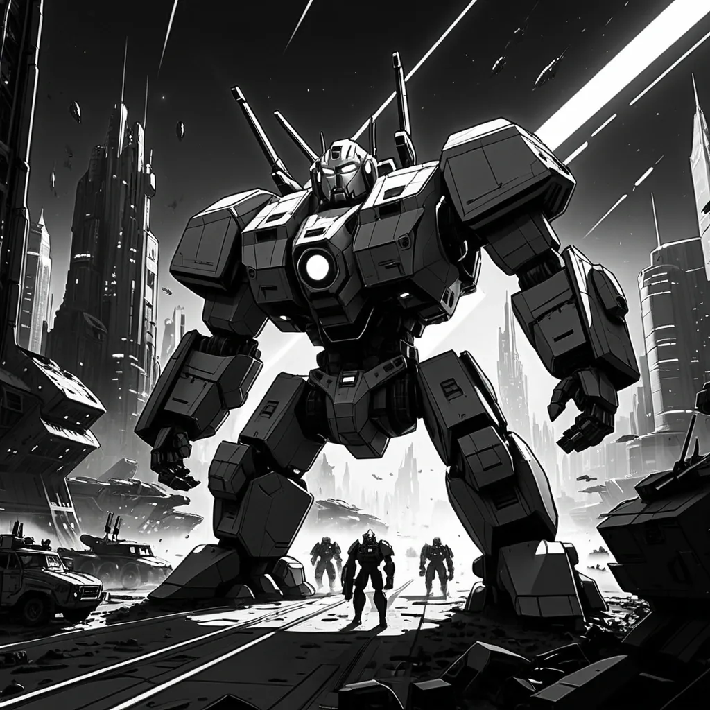 PROMPT DE GERAÇÃO DE IMAGEM OTIMIZADO (Para Midjourney/DALL-E/etc.): "crie uma ilustração de uma guerra futurista , onde robos gigantes são usados (eles possuem no máximo de 15 metros para poderem ter maior eficiencia em combate , os pilotos ficam dentro deles em uma cabine). o cenário é uma cidade que está sendo destruída pelo confronto de duas forças. , Desenho Animado , Iluminação: Dramática (Alto Contraste) , Tonalidade: Preto e Branco" --ar 16:9 --------------------------------- DETALHES DA ESTRUTURAÇÃO: - Estilo: Desenho Animado (Estilo Disney) - Proporção: 16:9 (Paisagem) - Iluminação: Dramática (Alto Contraste) - Tonalidade: Preto e Branco ,