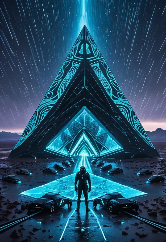 A futuristic scene unfolds with swirling rainy. In the midst of this turbulence , a majestic triangle-drone , intricately designed with bioluminescent patterns showcases their multi-layered floors as they soar through a dark indigo sky infused with light cyan hues. Below , a desert landscape at twilight comes to life with its intricate architecture. An astronaut stands in the foreground beside their sleek robot-dogs and scattered belongings. As the storm rages around them , a menacing caravan emerges through the sheets of rain , droplets frozen in motion against this surreal backdrop. ,