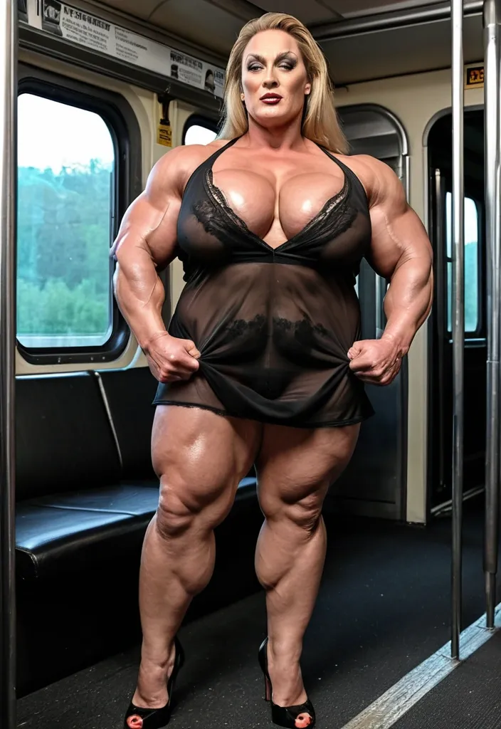 À giant muscular chubby femalebodybuilder , housewife woman BBW musclée , heavy weight bodybuildeuse géante et plantureuse with giant chest , imposante dame massive , beautiful make up Meryl Streep face , in a train , avec de gros seins , énormes biceps musclés , in black laces transparent very short mini loose nightgown with heels , exposant les seins , bras musclés exposés , dominante , jambes massives exposées , agressive , ,