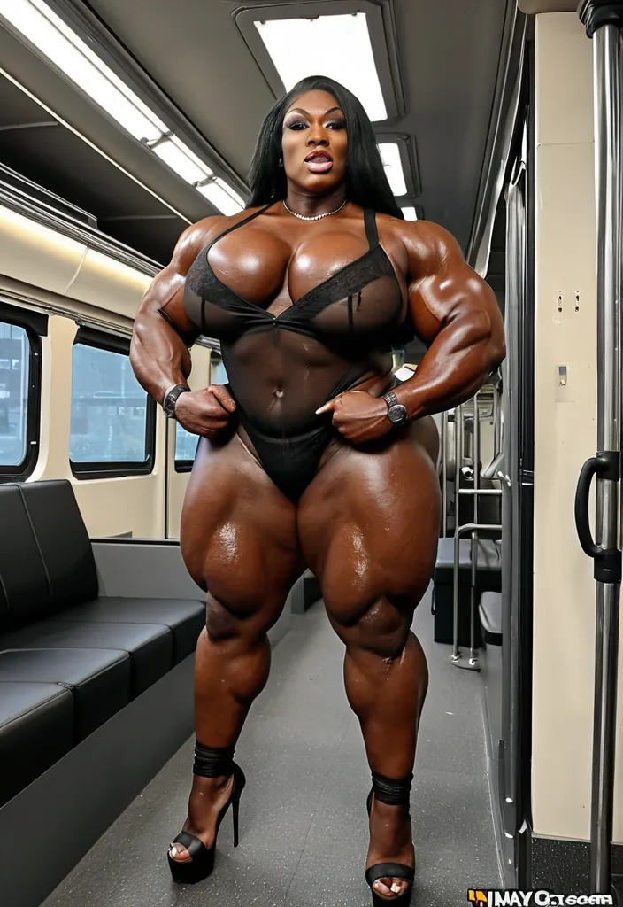 À african giant muscular chubby femalebodybuilder , housewife black woman BBW musclée , heavy weight bodybuildeuse géante et plantureuse with giant chest , imposante dame massive , beautiful make up Naomi Campbell face , in a train , avec de gros seins , énormes biceps musclés , in black transparent short mini nightgown with heels , exposant les seins , bras musclés exposés , dominante , jambes massives exposées , agressive , ,