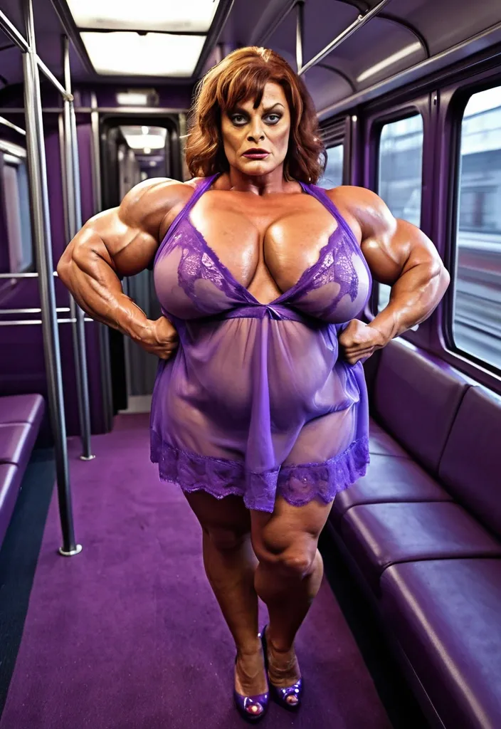 À giant muscular chubby femalebodybuilder , housewife woman BBW musclée , heavy weight bodybuildeuse géante et plantureuse with giant chest , imposante dame massive , beautiful make up Susan Sarandon face , in a train , avec de gros seins , énormes biceps musclés , in violet laces transparent short mini loose nightgown with heels , exposant les seins , bras musclés exposés , dominante , jambes massives exposées , agressive , ,