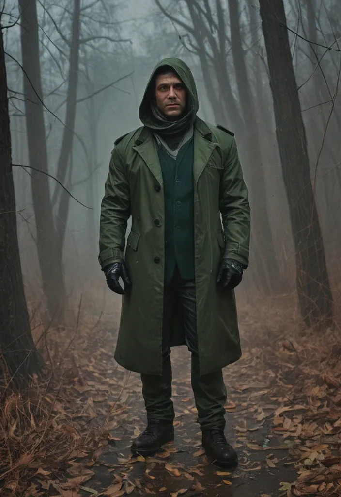 A pale , composed Xenomorph Queen sits enthroned on a massive rusted iron chair , her posture still and commanding. She wears an elaborate floor-length coat or robe of aged , textured fabric , its surface embossed or sculpted to resemble a exposed spinal column and ribcage running the full length of her torso , the bones rendered in weathered tones of brown and grey. The garment drapes heavily over her legs and pools at her feet. Her crown is an intricate dark structure of twisted bone-like protrusions , black crystal shards , and wide curving ram horns that sweep upward and outward from either side of her head , giving her silhouette a striking , monstrous width. Her face is calm and pale , her eyes meeting the viewer directly with no expression of warmth or hostility. The throne behind her is corroded and monolithic , its surface thick with rust and age. The raised platform she sits on and the entire ground surrounding her is covered in dozens of aged human skulls and loose bones , stacked and scattered in every direction as far as the frame allows. The background is a deep , swirling grey fog that diffuses any sense of location or forestry , pressing the composition inward and giving the image a suffocating , timeless quality. ,