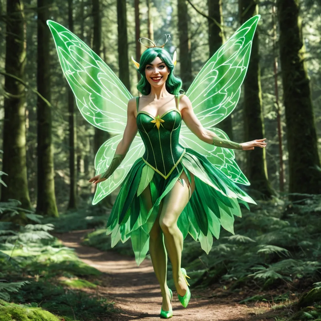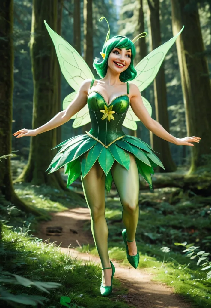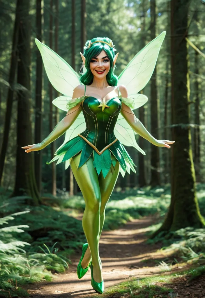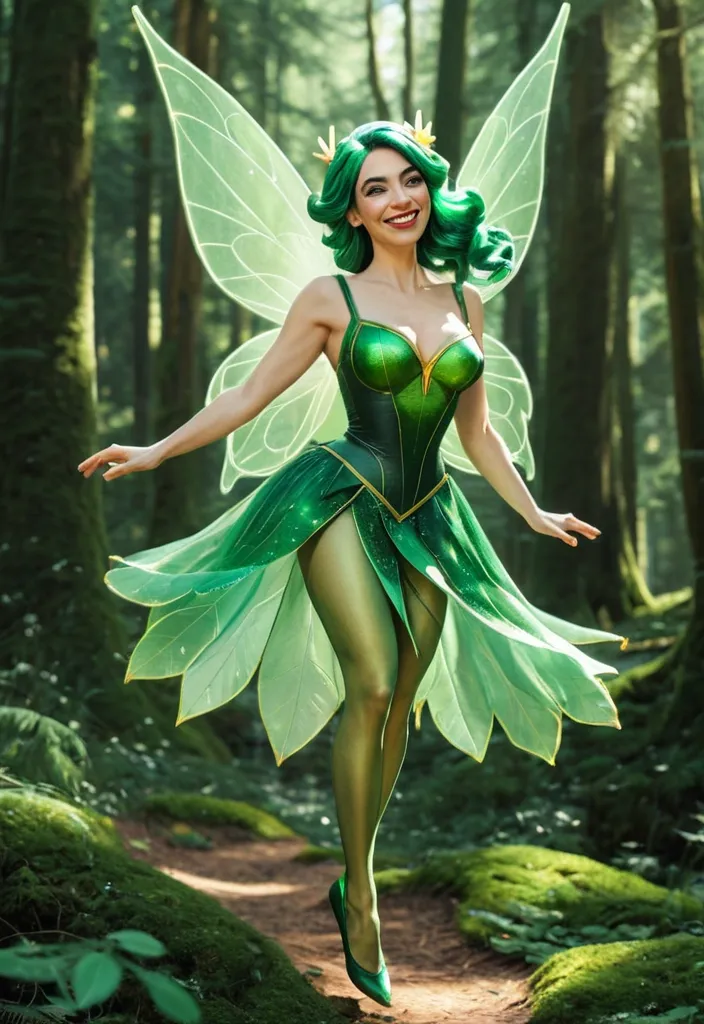 Photorealistic full lenght wavy shoulder redhead fox 30yo woman wearing a short green medieval open lace shirt , complete with a lush , flowing fox tail. Barefoot. Her face is distinctly human with expressive , bright eyes and a gentle smile. The scene is set on a beautiful forest with soft , warm lighting , casting a golden hour glow that highlights the textures of her fu ,