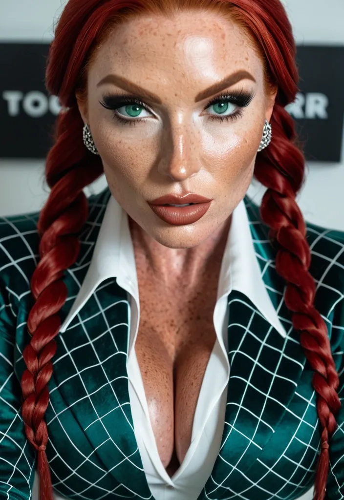 Generate Gorgeous female boss , bimbo , hourglass body , abnormally massive female bodybuilder , gorgeous , close up , full lips , big booty , redheaded , freckles on face and breast , braided design hair , feminine silhouette , too big breast , big booty , sexy thighs abs , silhouette , up close , flexing biceps , beautiful green eyes , legs are iconic and defining physical feature , both visually and in terms of combat ability.wearing an outfit that is a striking blend of elegance , power , and femininity , designed to command attention in any room. The suit is tailored to perfection , hugging the wearer’s curves with precision while emphasizing a structured silhouette. The fabric itself is a refined grey tweed patterned with subtle white grid lines , giving the suit a texture that feels both sophisticated and modern. The blazer features broad blue lapels and gold button accents , adding a luxurious touch that elevates the look beyond typical business attire. The matching high-waisted trousers elongate the frame , further enhancing the poised and commanding effect of the ensemble.The styling choices amplify the boldness of the suit. The inner blouse is a silky , greybutton-down shirt that complements the tweed’s tone while introducing a softer , feminine balance to the sharp tailoring of the jacket. The blouse peeks out neatly from under the blazer , maintaining elegance without drawing focus away from the suit’s commanding cut. Accessories are kept minimal yet intentional: a delicate layered gold necklace and hoop earrings that add glimmers of light and luxury without overpowering the outfit. The choice of voluminous , honey-brown braids cascading down her shoulders frames the face with both confidence and glamour , completing the commanding visual.Altogether , this look communicates a blend of authority and allure. It is business-ready yet fashion-forward , balancing corporate structure with vibrant femininity. The color palette blue , grey and gold avoids being overly delicate , instead embracing the richness of texture , structure , and presence. This is the kind of ensemble that speaks to ambition , sophistication , and personal style—ideal for someone who thrives in positions of influence but insists on expressing her individuality with bold elegance. It’s not just clothing—it’s a statement of power wrapped in grace. In luxury living legs that could crush a watermelon , skirt high boots are a bold and striking statement piece , crafted in glossy black patent leather that gives them a sleek , polished finish. Rising to just below the knee , the boots feature three adjustable buckle straps along the shaft , adding both edge and detail to their design. The towering stiletto heel , paired with a thick platform sole , creates an ultra-dramatic silhouette that elongates the leg and exudes power and confidence. With their combination of shine , height , and structure , these boots perfectly balance fierce femininity with high-fashion allure. Massive breast , massive cleavage , Up close shot , dark teal , velvet geometric rectangle and square pattern blazer , white stylish blouse , matching skirt , gorgeous green eyes , freckles ,